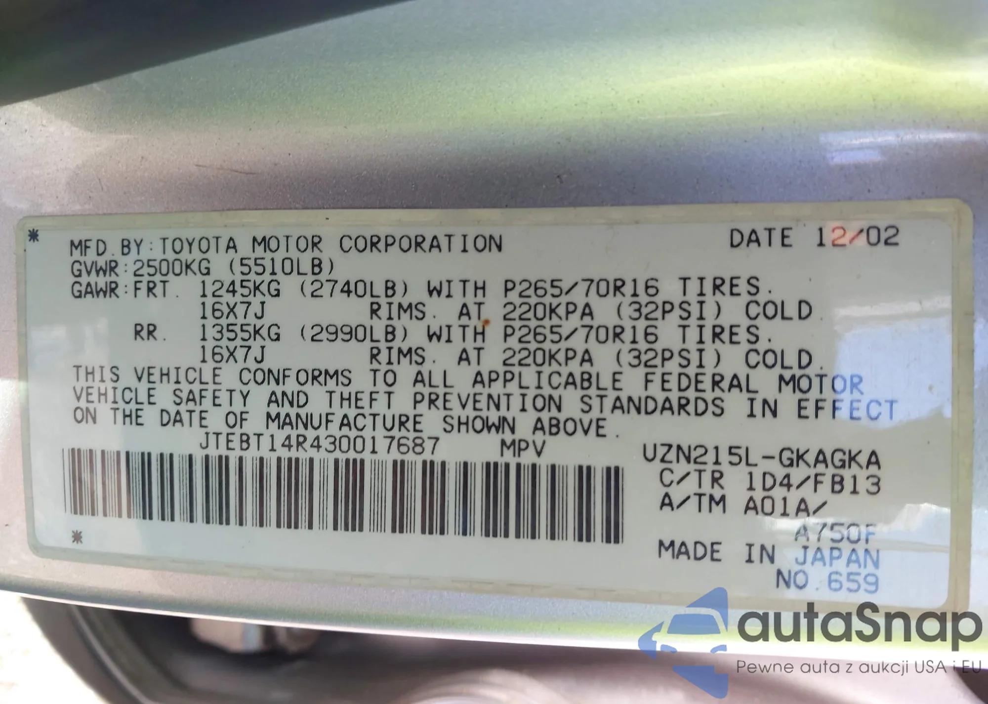 LOT: 43506876 VIN: JTEBT14R430017687