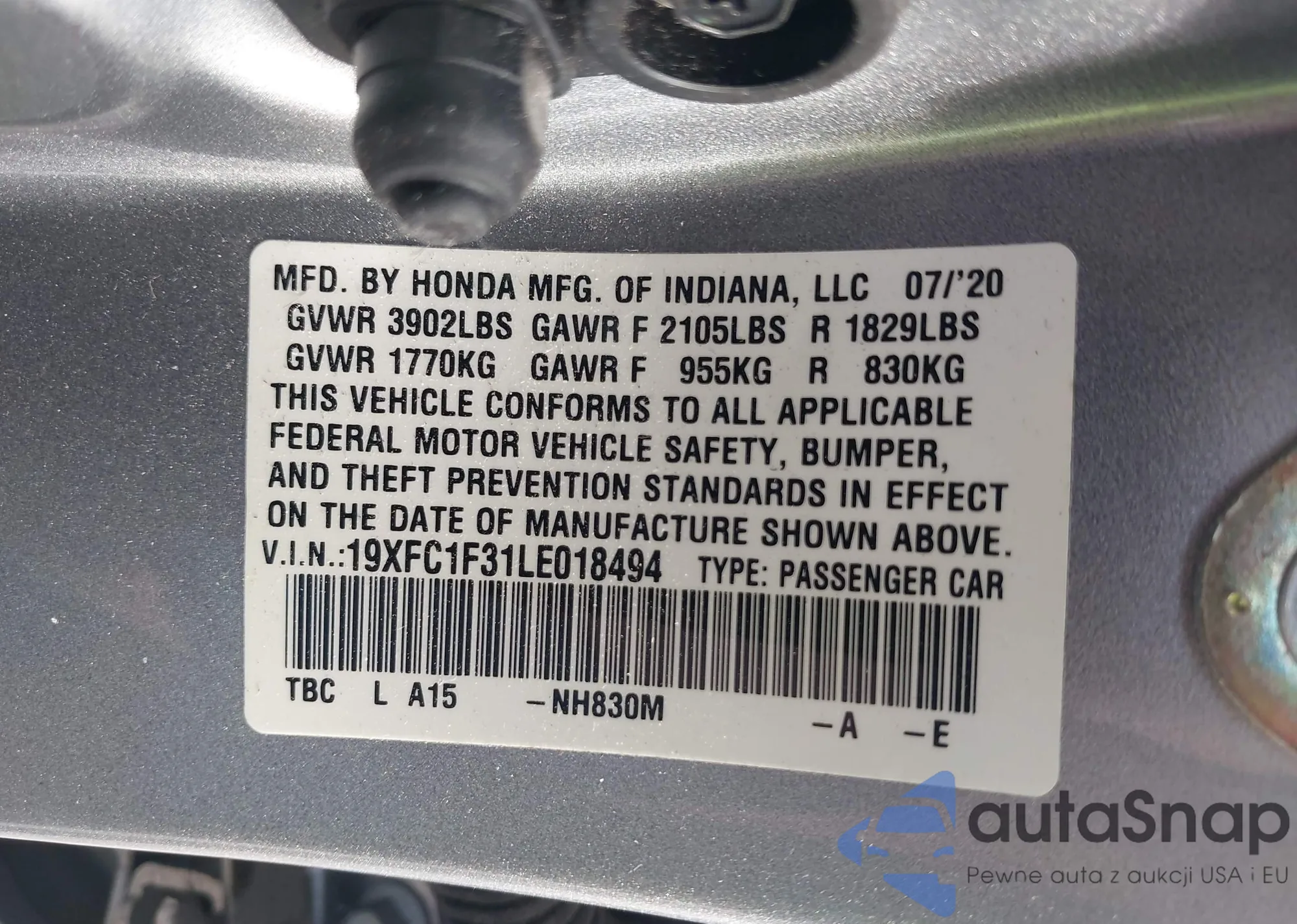 • VIN 19XFC1F31LE018494