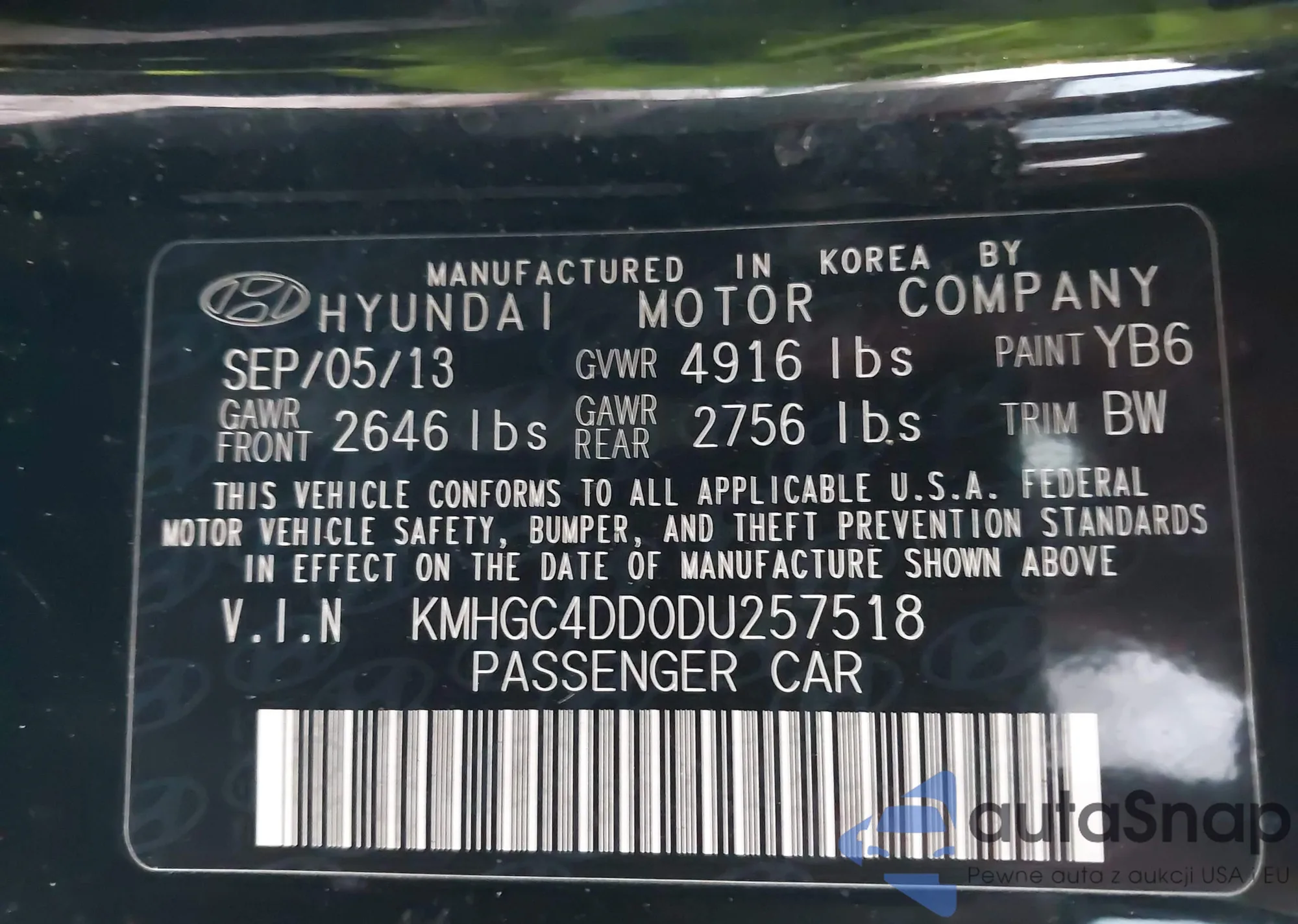 LOT: 41751222 VIN: KMHGC4DD0DU257518