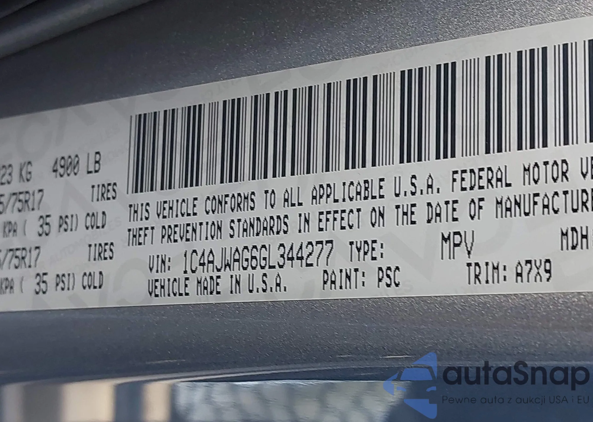 • VIN 1C4AJWAG6GL344277