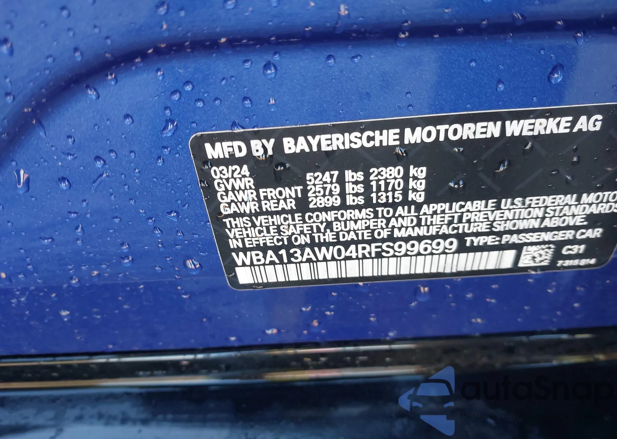 LOT: 43511187 VIN: WBA13AW04RFS99699