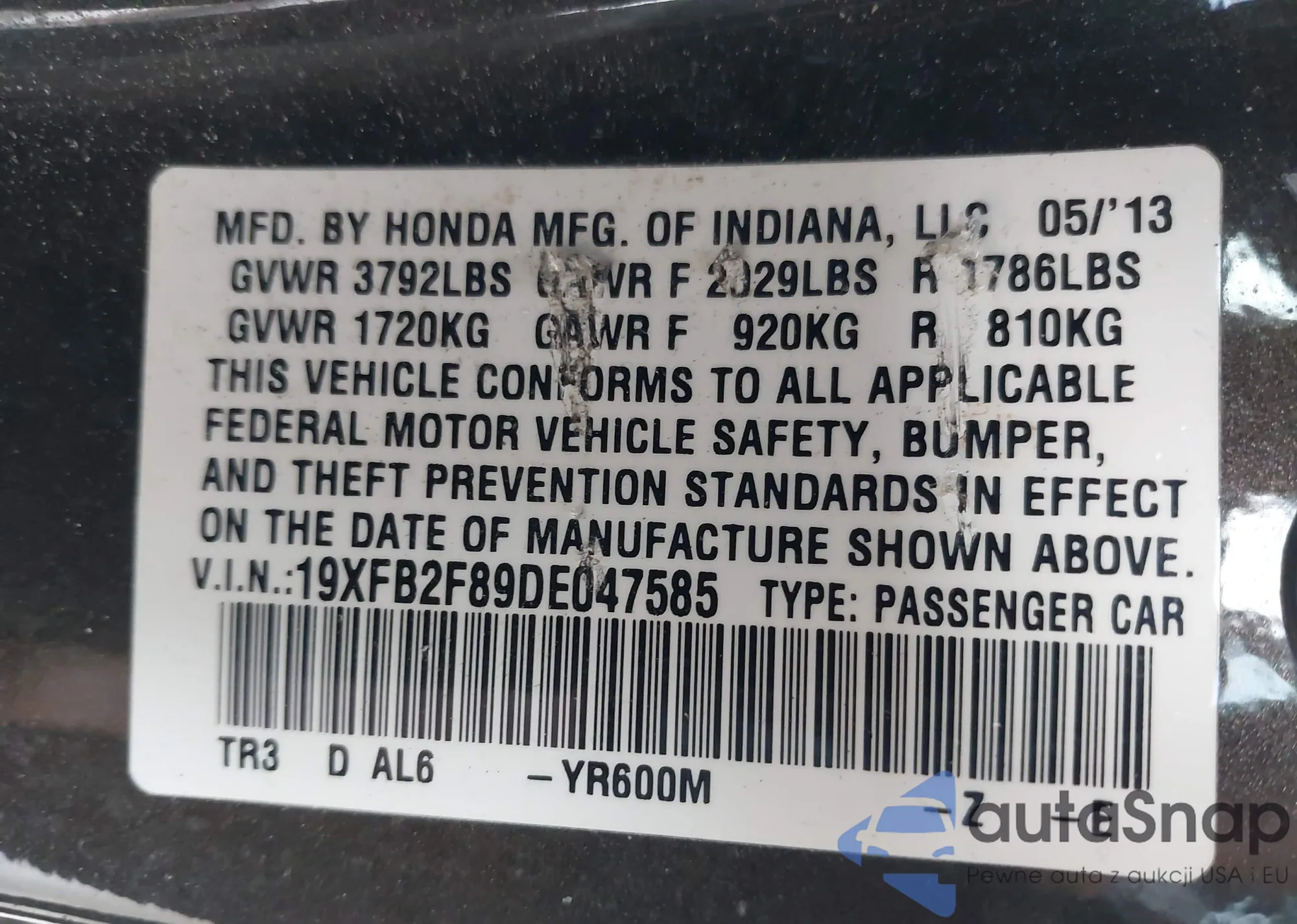 LOT: 43561951 VIN: 19XFB2F89DE047585