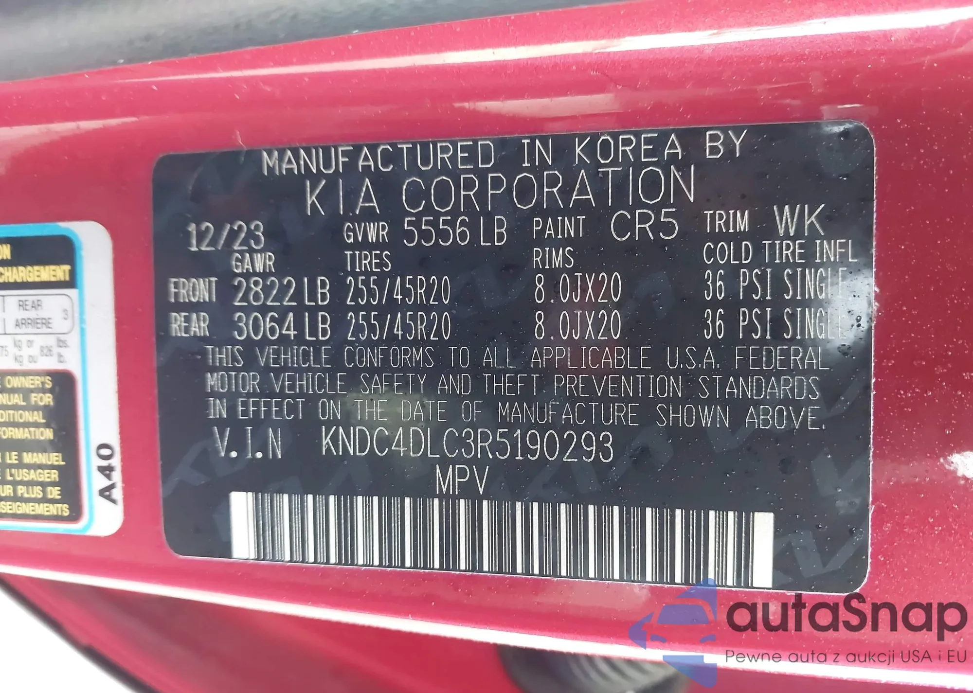 LOT: 43719428 VIN: KNDC4DLC3R5190293
