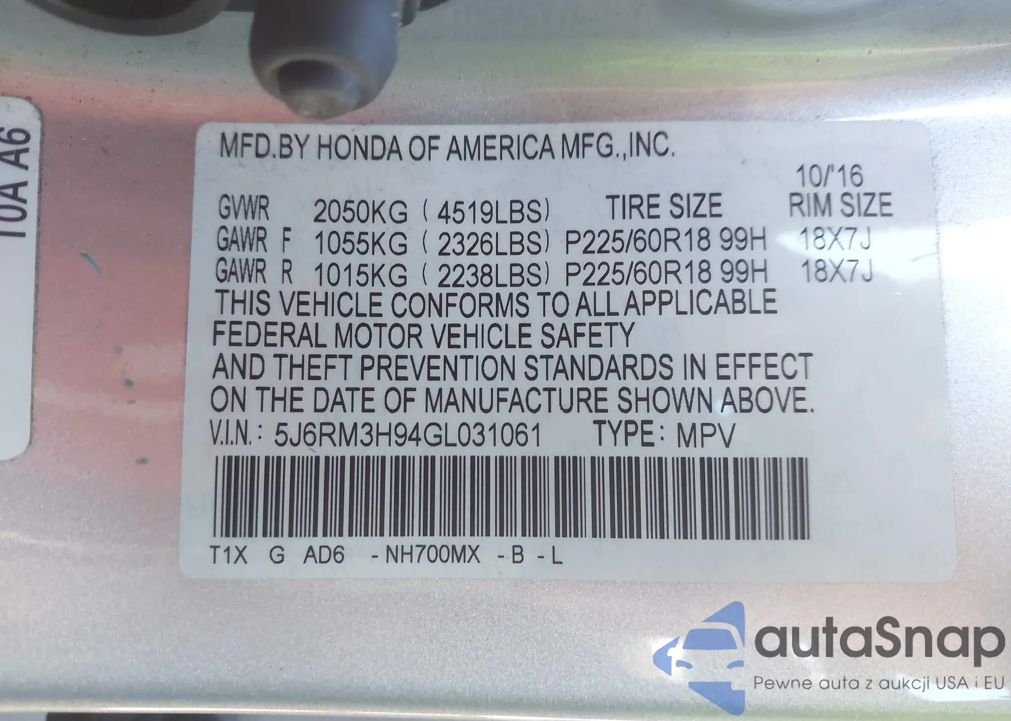 • VIN 5J6RM3H94GL031061