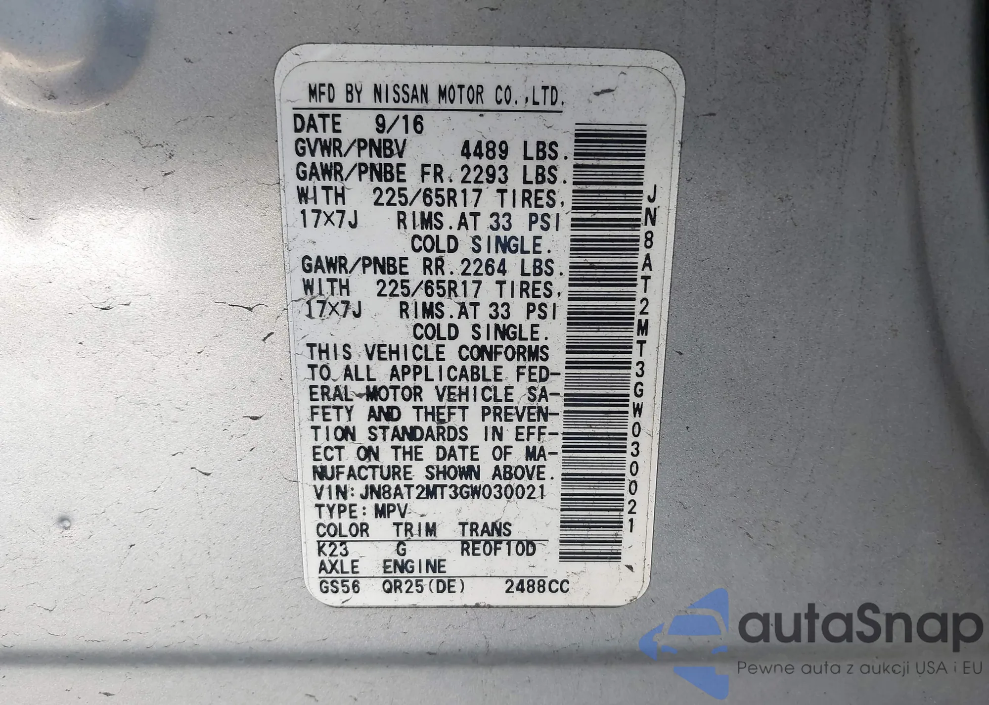 LOT: 43733802 VIN: JN8AT2MT3GW030021