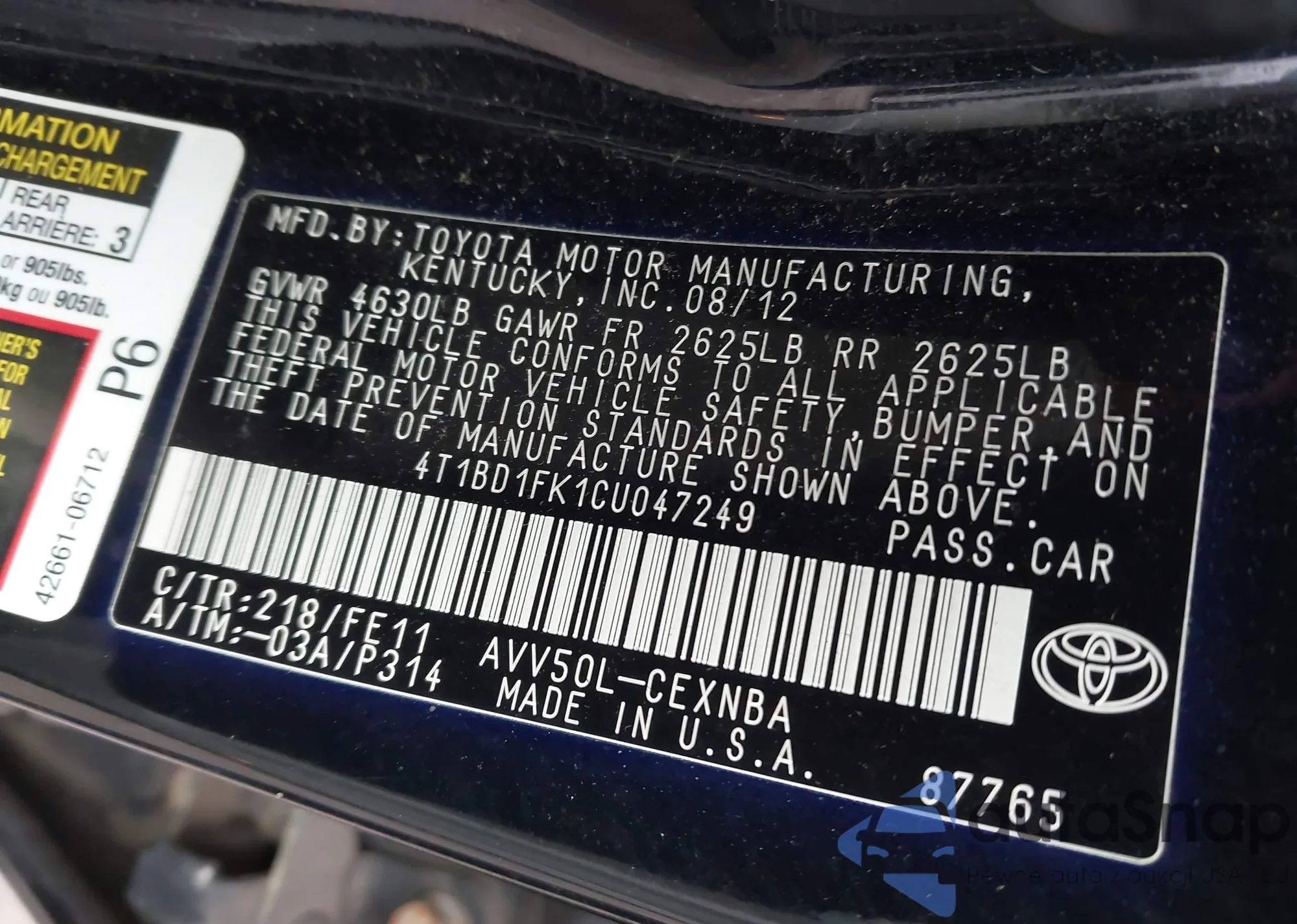 LOT: 43765103 VIN: 4T1BD1FK1CU047249