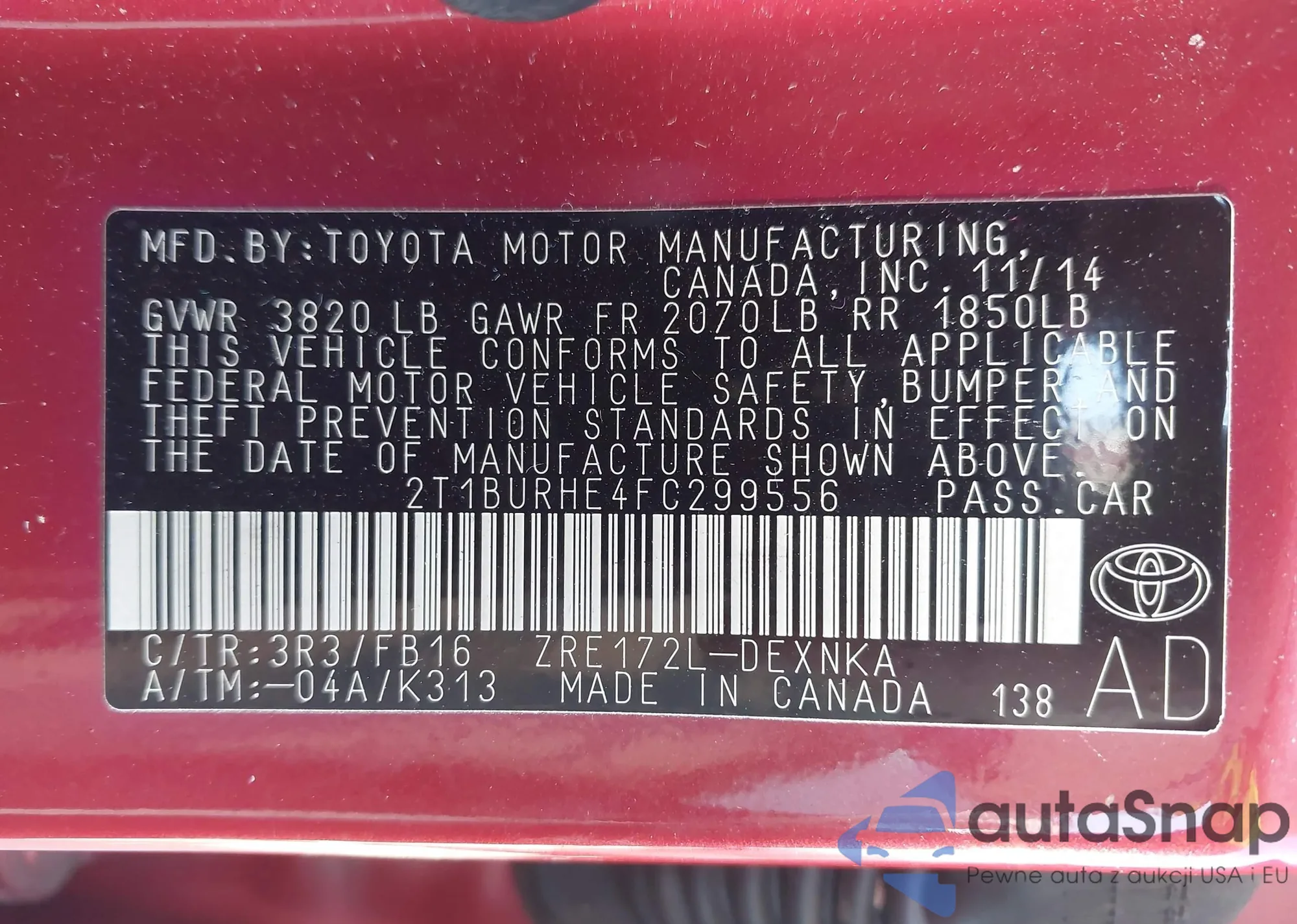 • VIN 2T1BURHE4FC299556