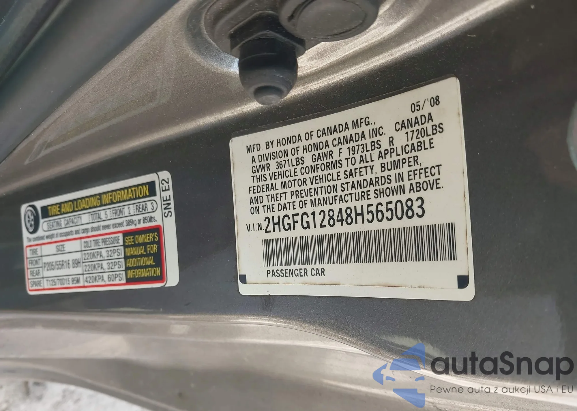 LOT: 43642527 VIN: 2HGFG12848H565083