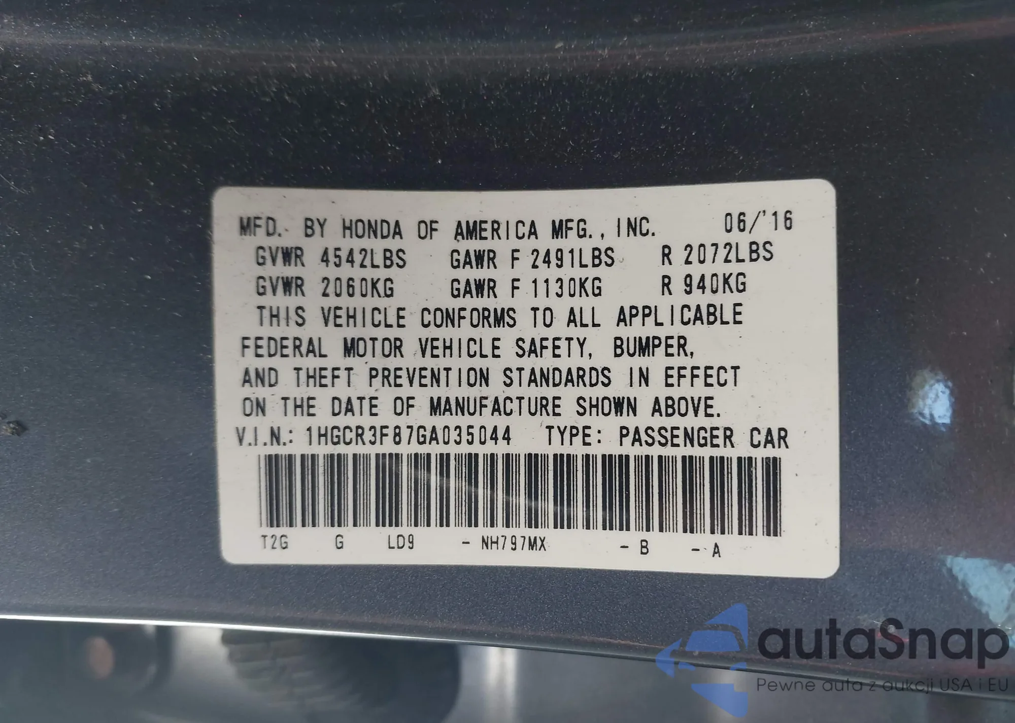 LOT: 43874833 VIN: 1HGCR3F87GA035044