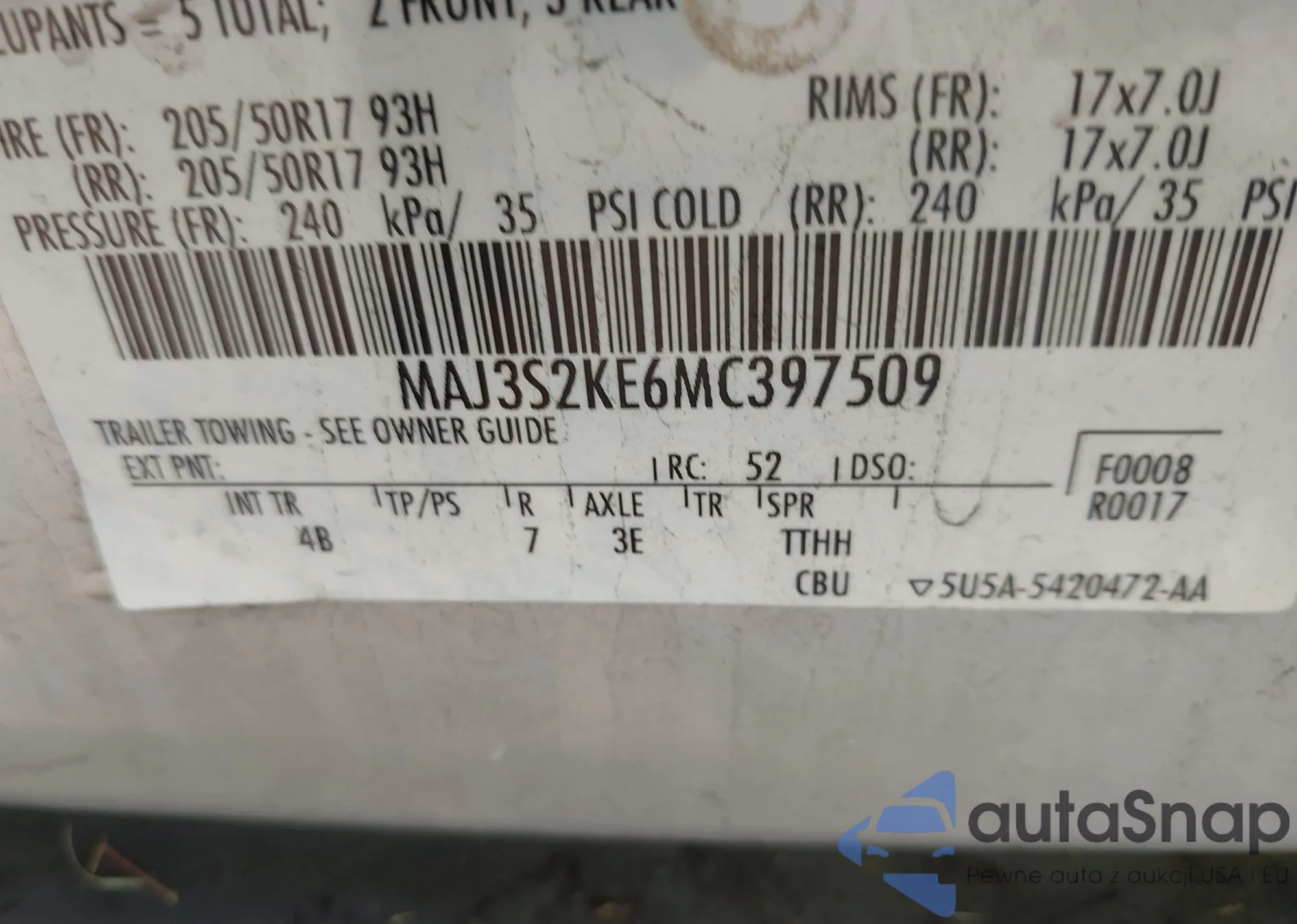 LOT: 43152305 VIN: MAJ3S2KE6MC397509