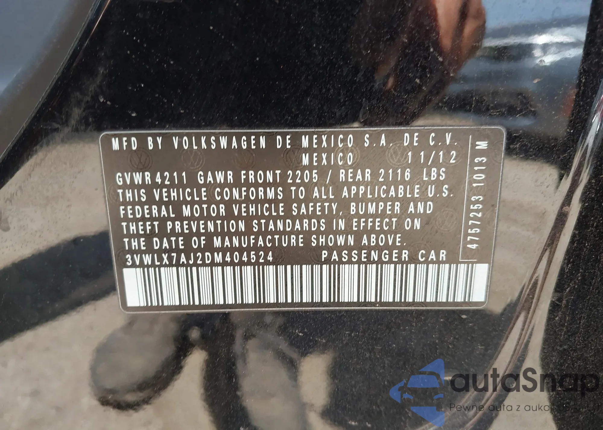 LOT: 43670687 VIN: 3VWPL7AJXDM682682