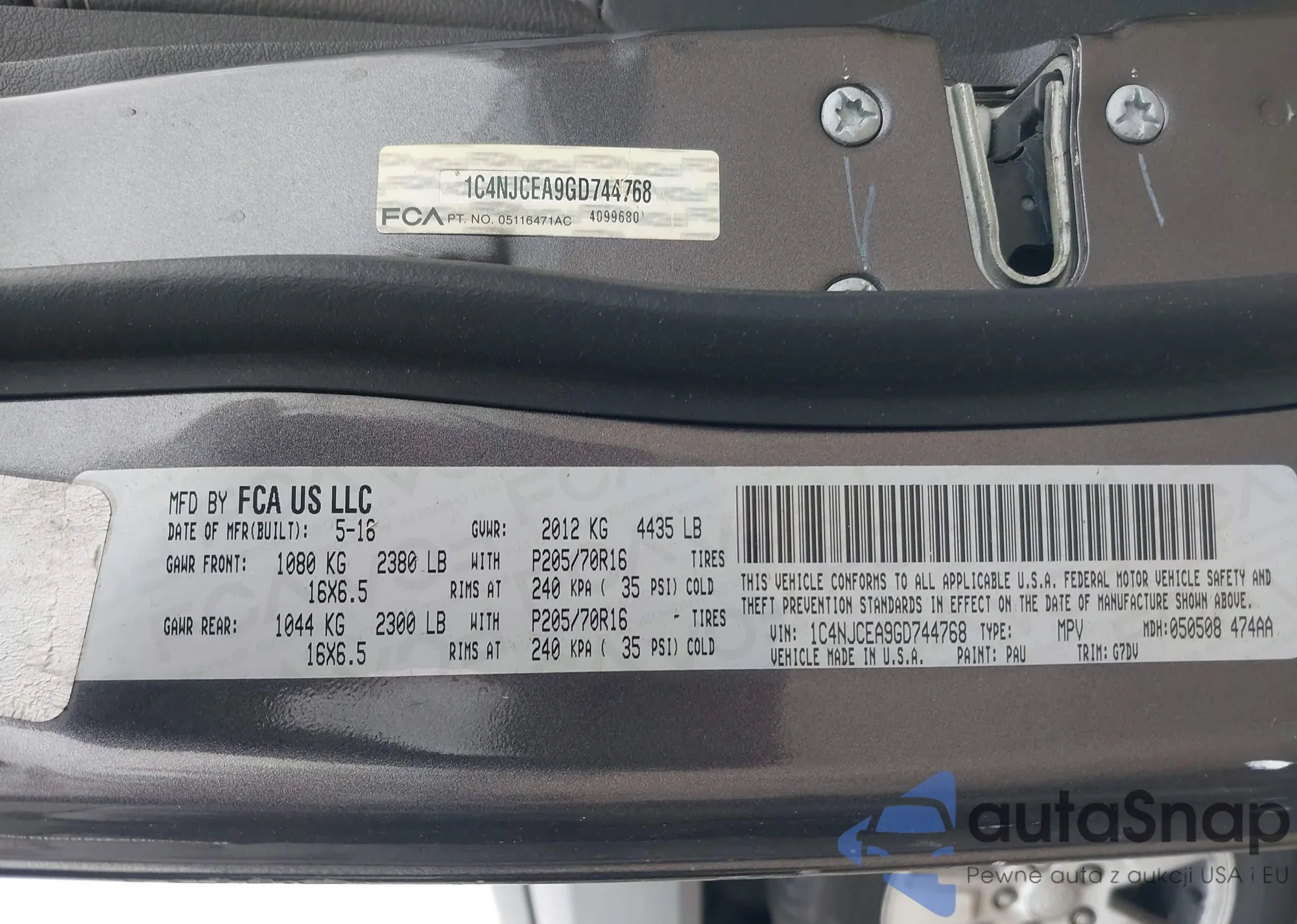 LOT: 43895525 VIN: 1C4NJCEA9GD744768