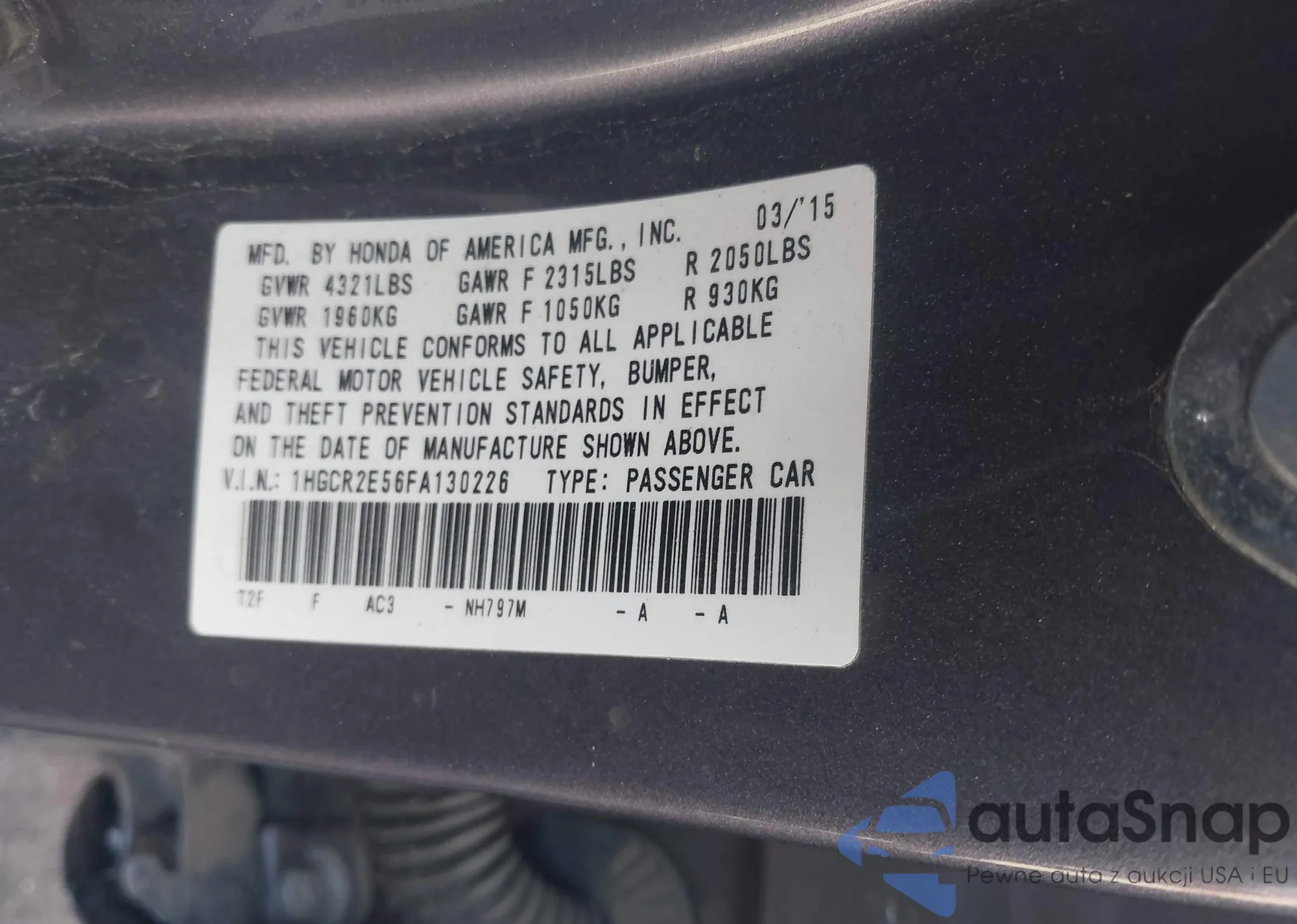 LOT: 43540460 VIN: 1HGCR2E56FA130226