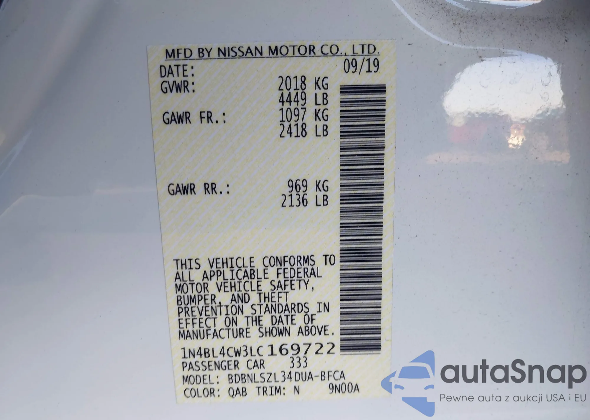 LOT: 43542243 VIN: 1N4BL4CW3LC169722