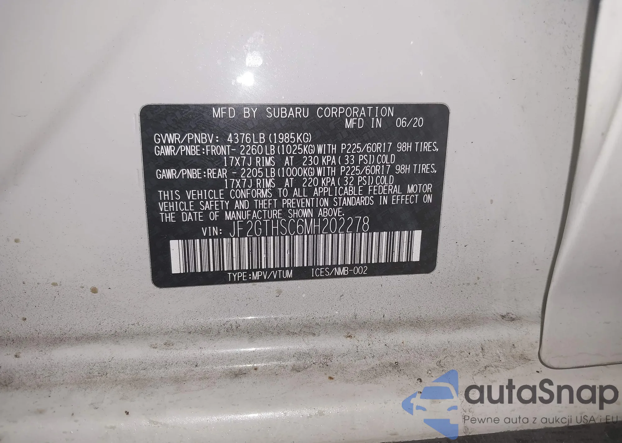 LOT: 43779424 VIN: JF2GTHSC6MH202278