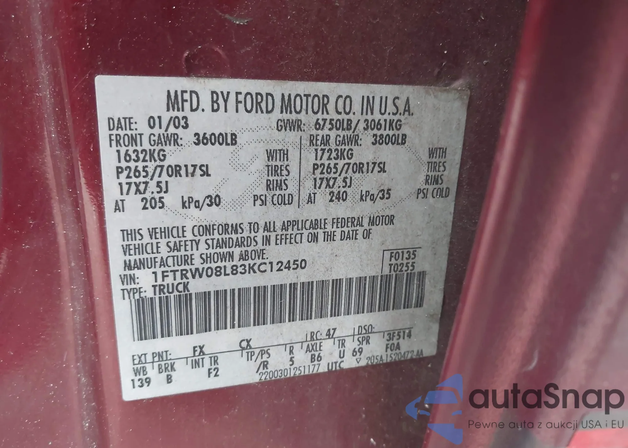 • VIN 1FTRW08L83KC12450