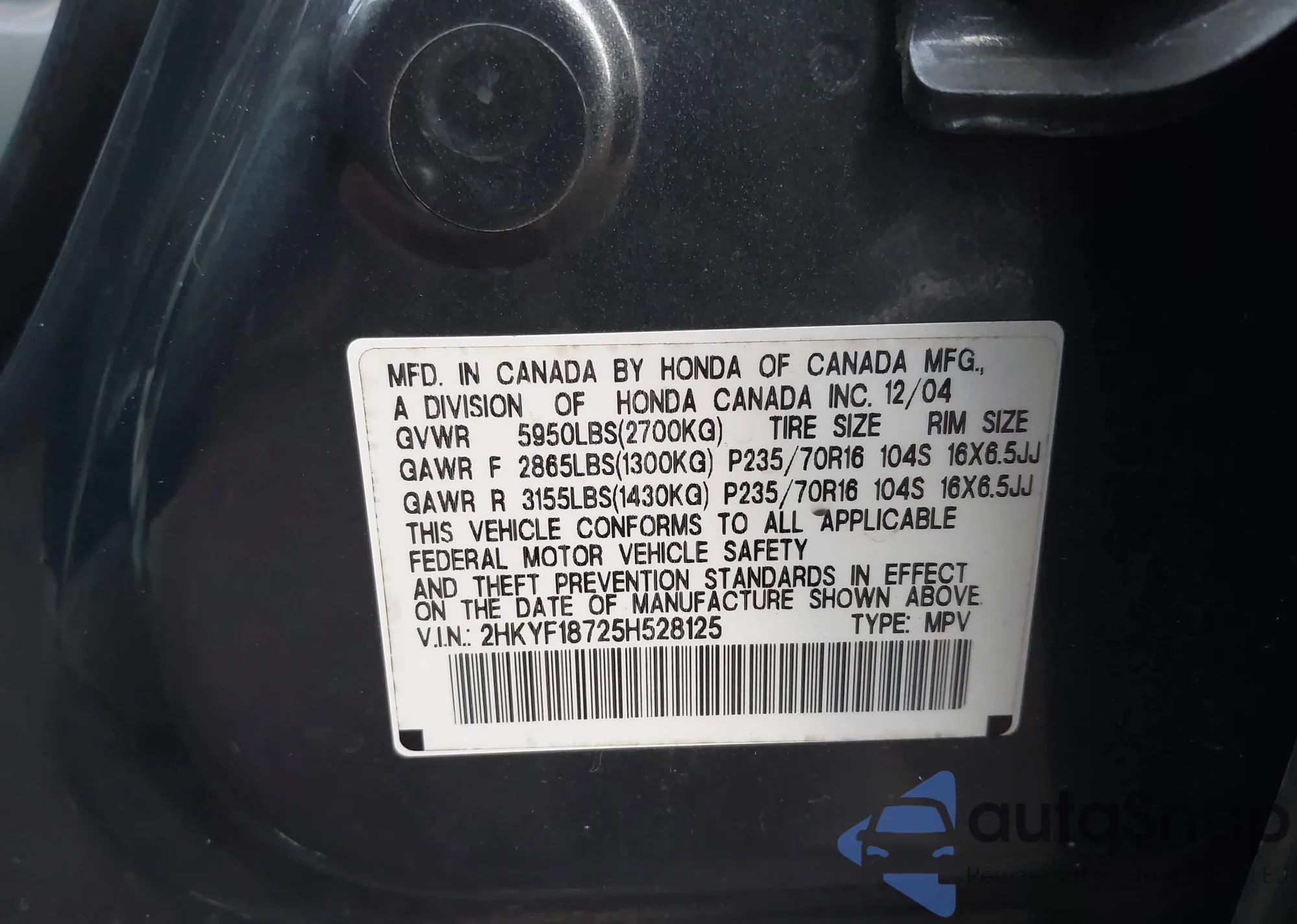 • VIN 2HKYF18725H528125