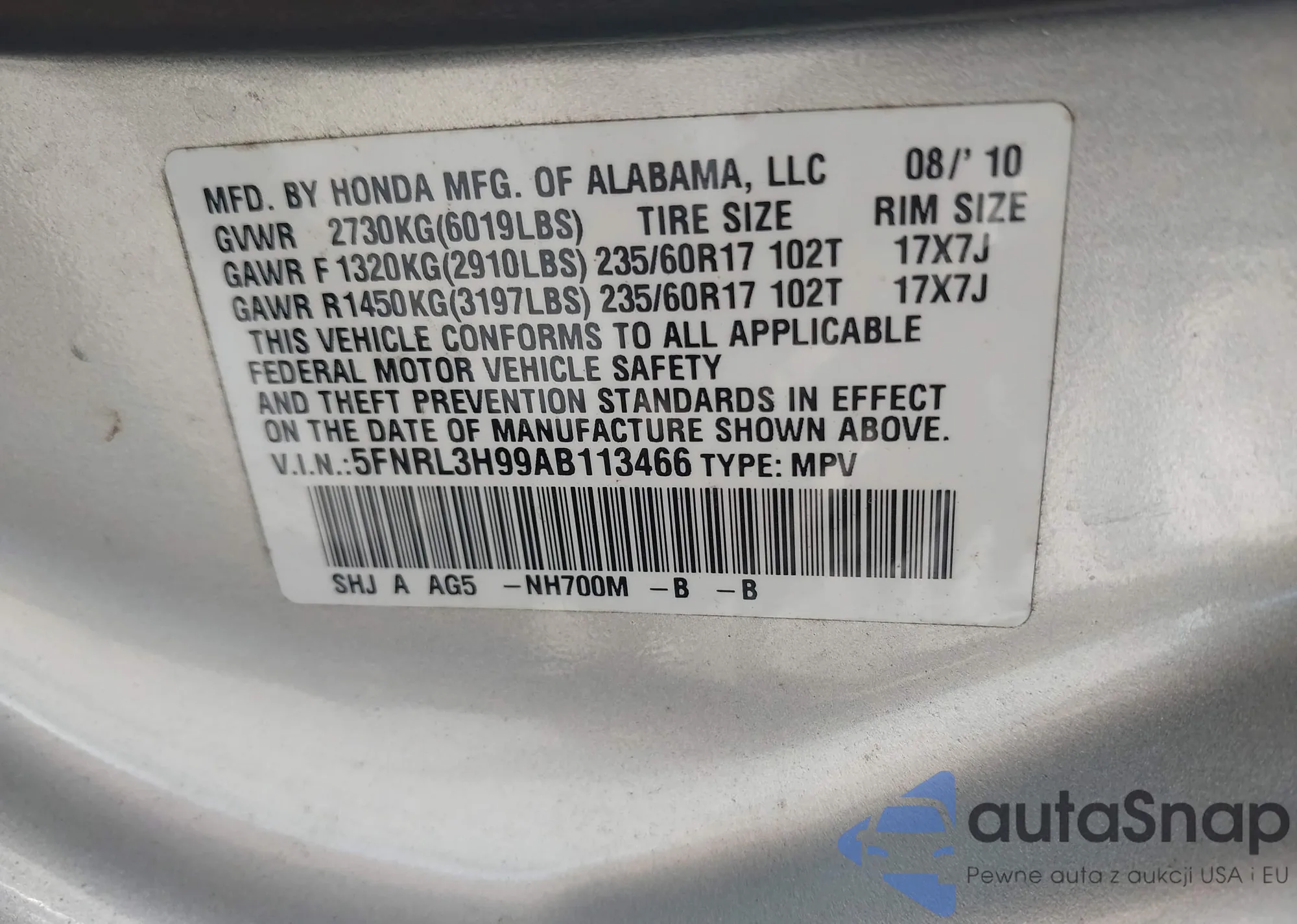 • VIN 5FNRL3H99AB113466