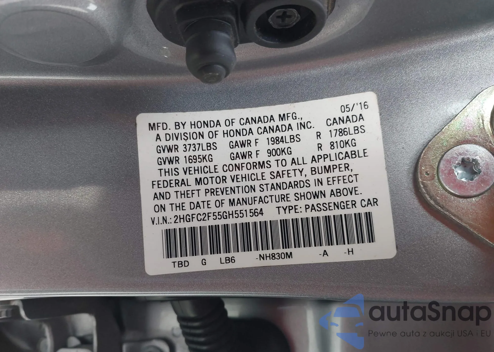 LOT: 43698496 VIN: 2HGFC2F55GH551564