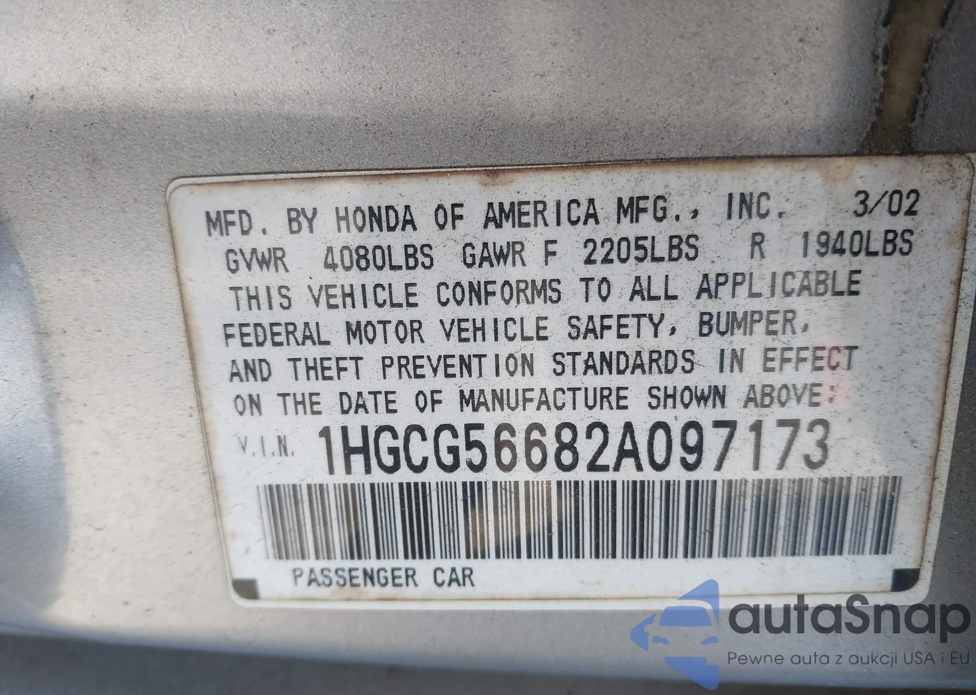 LOT: 43911942 VIN: 1HGCG56682A097173