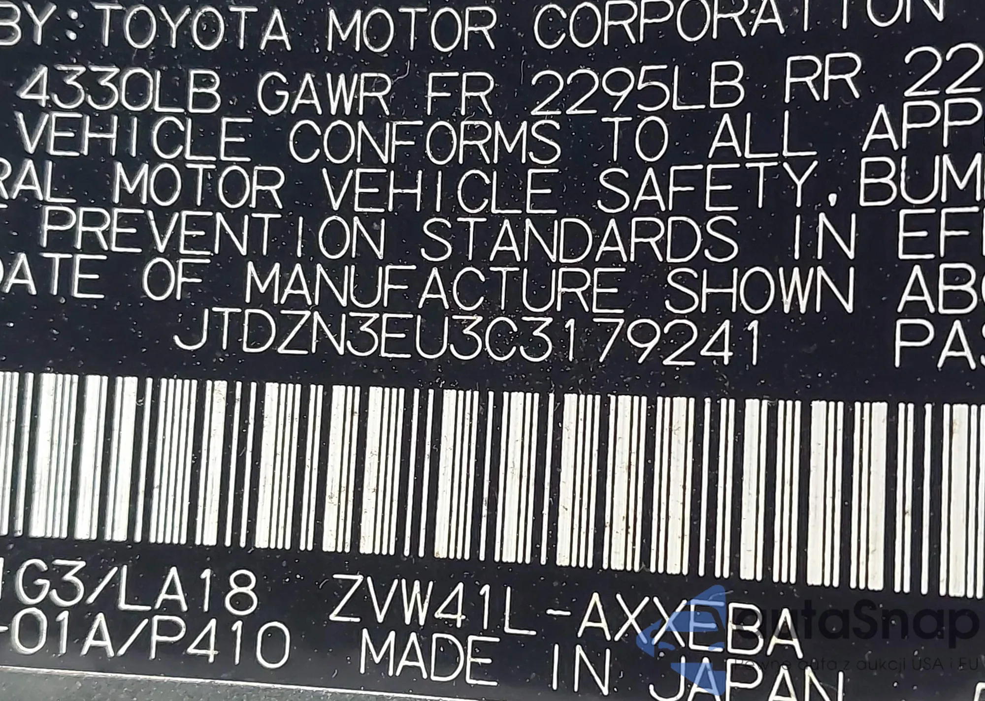 LOT: 43845241 VIN: JTDZN3EU3C3179241