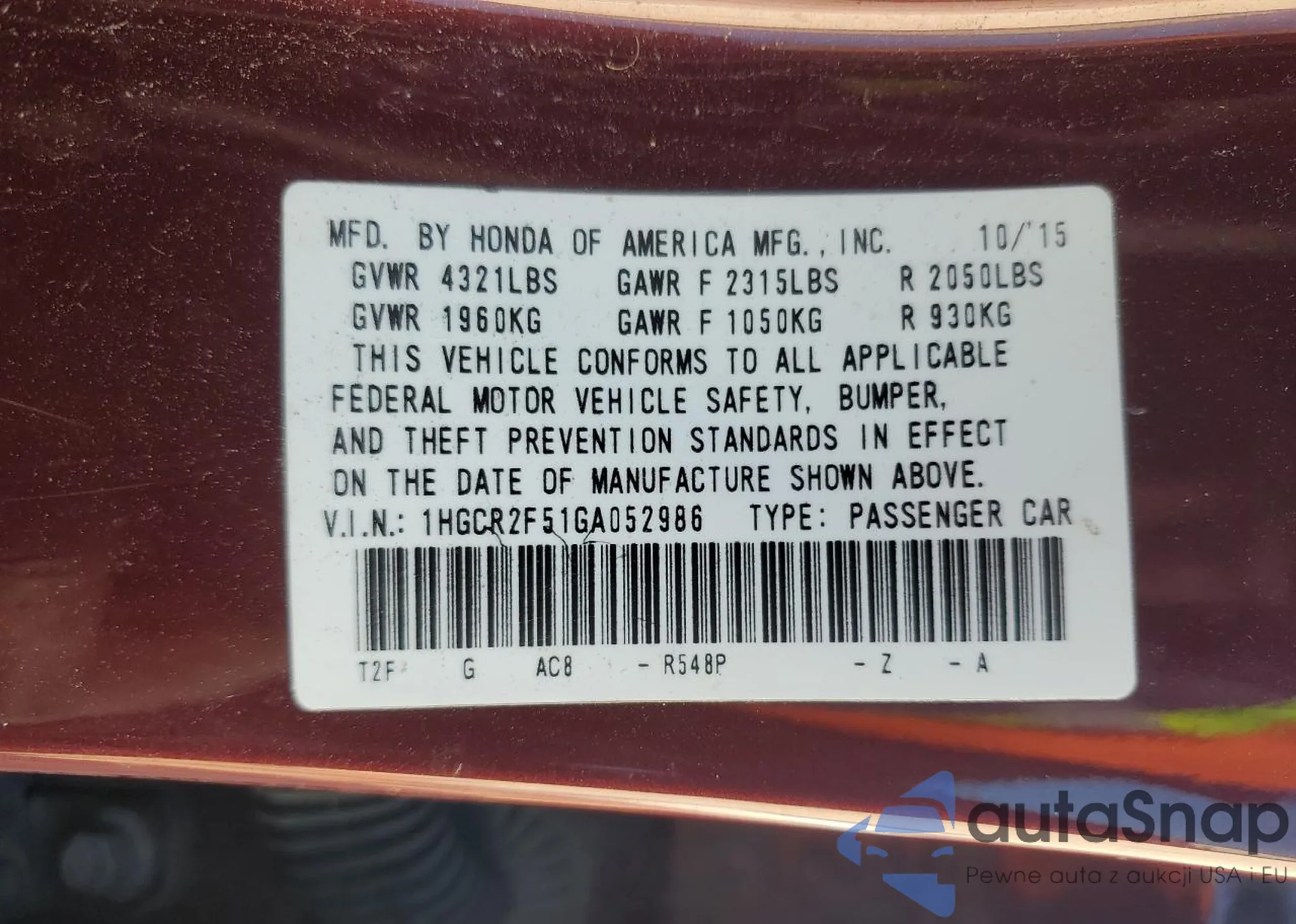 LOT: 85859505 VIN: 1HGCR2F51GA052986