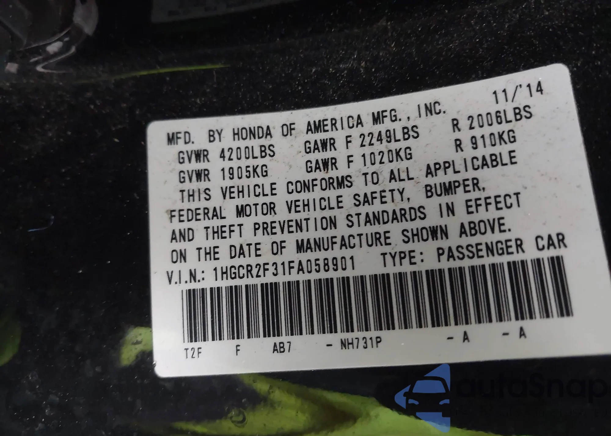 • VIN 1HGCR2F31FA058901