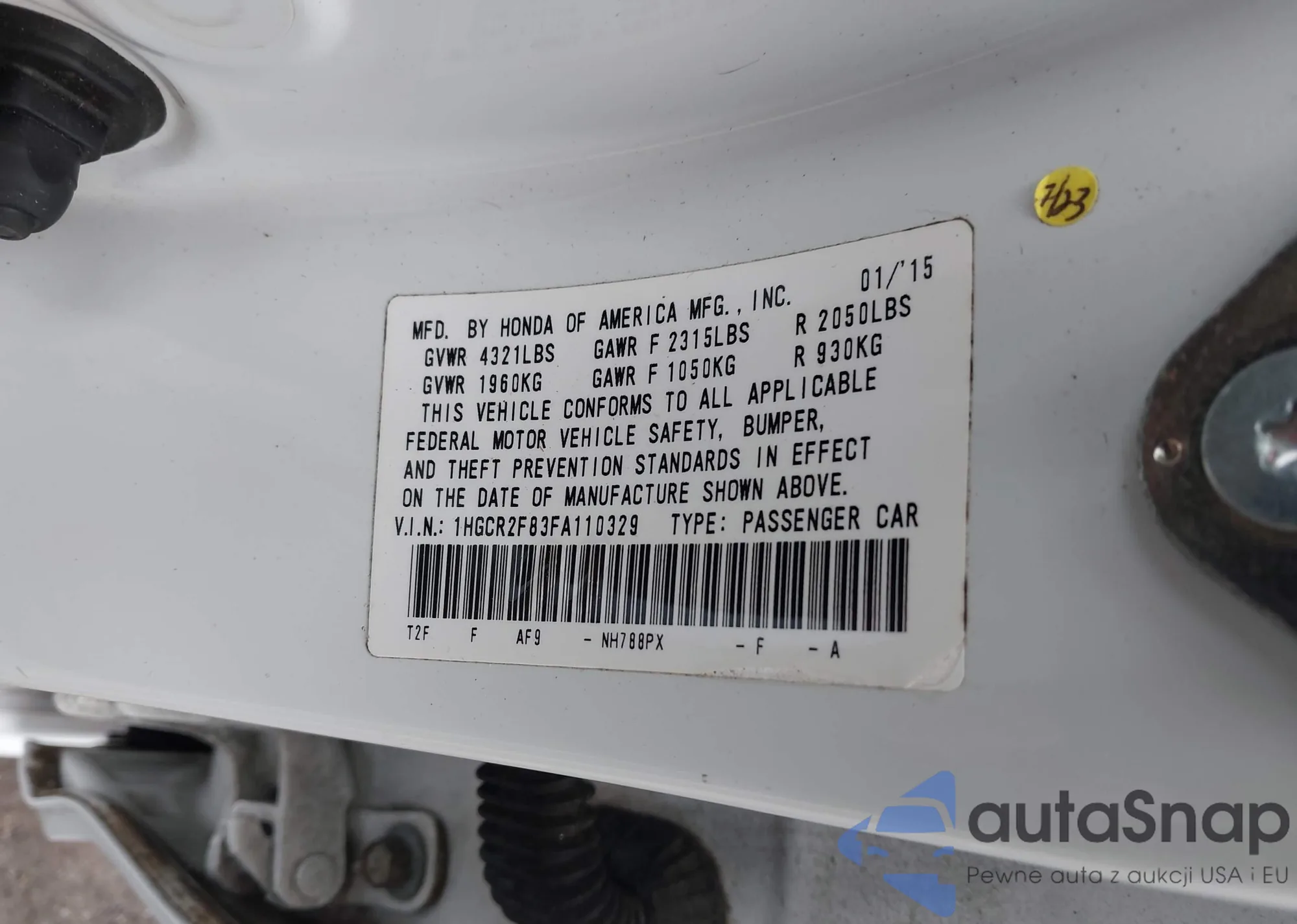 LOT: 43476037 VIN: 1HGCR2F31FA058901
