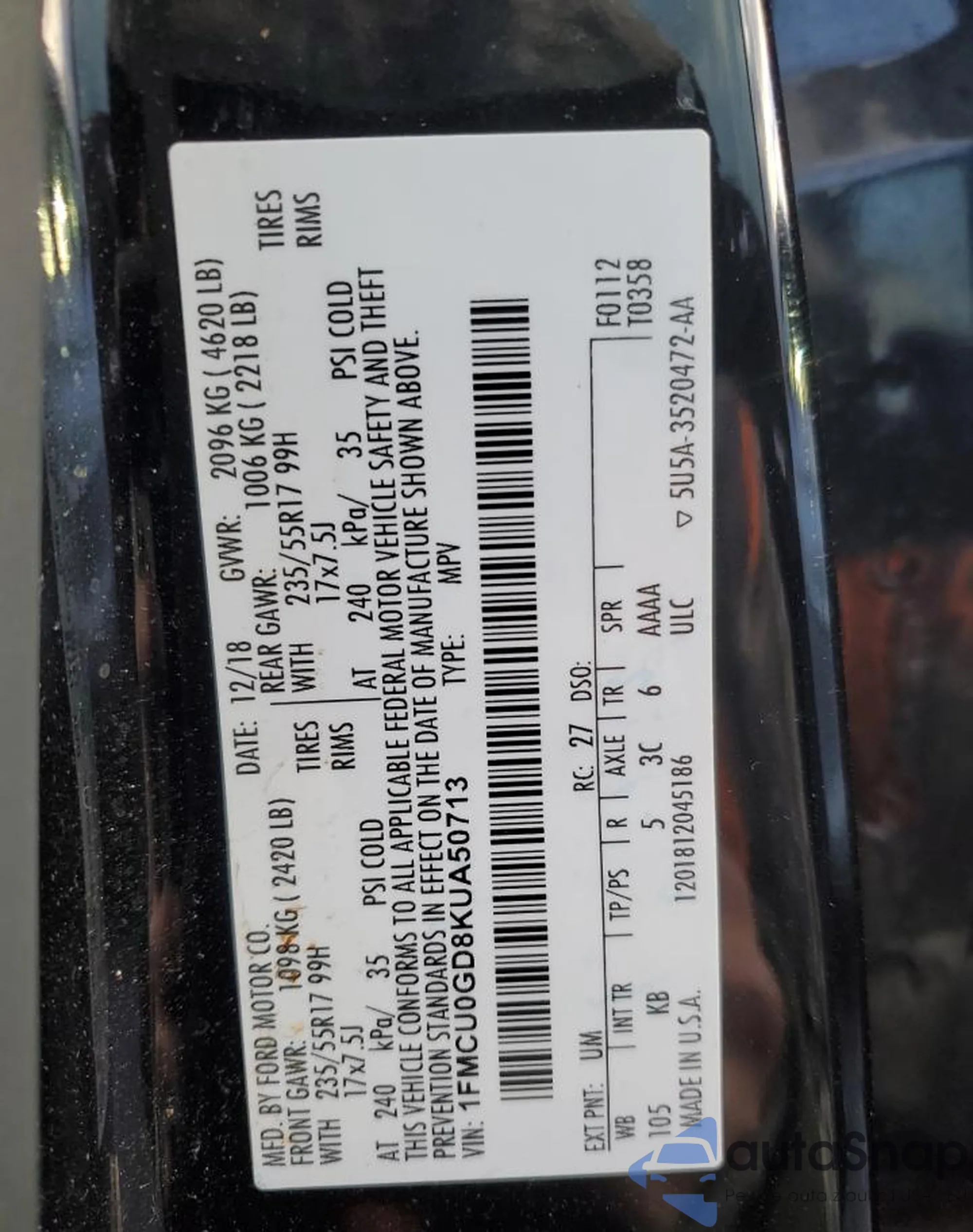LOT: 92065555 VIN: 1FMCU0GD8KUA50713