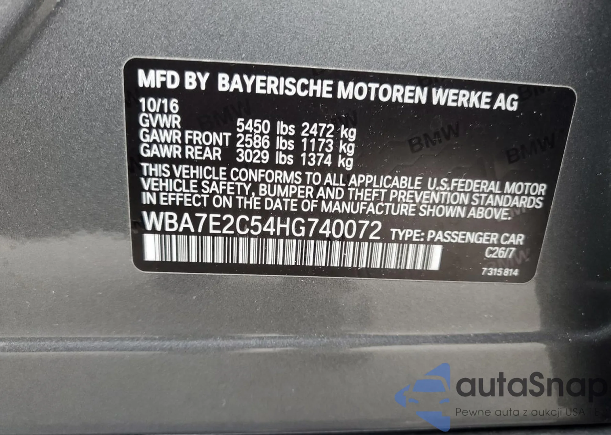 LOT: 90937105 VIN: WBA7E2C54HG740072