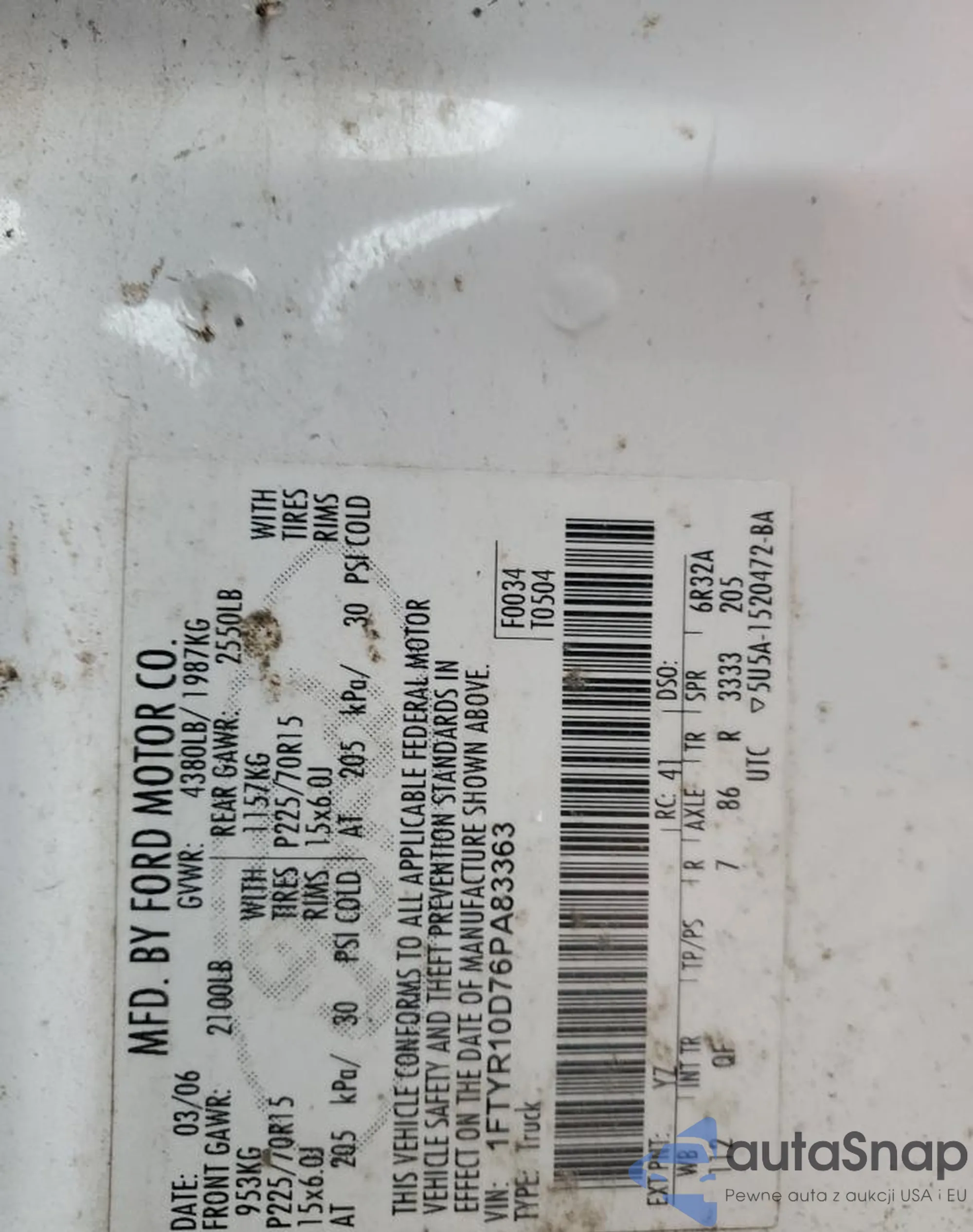 LOT: 90456365 VIN: 1FTYR10D76PA83363