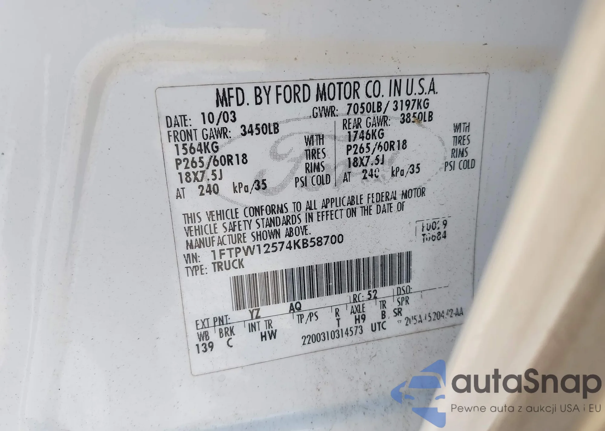 • VIN 1FTPW12574KB58700