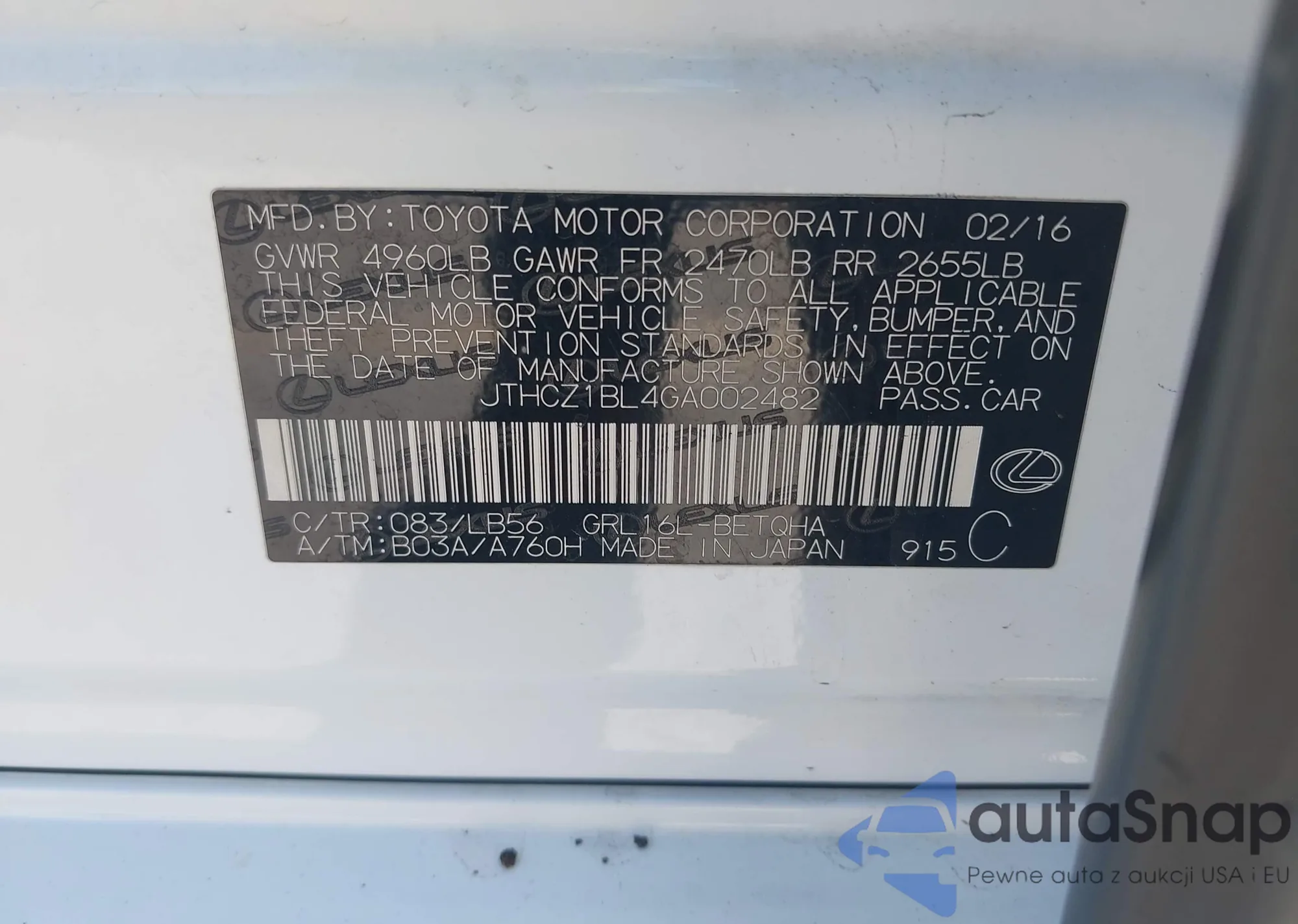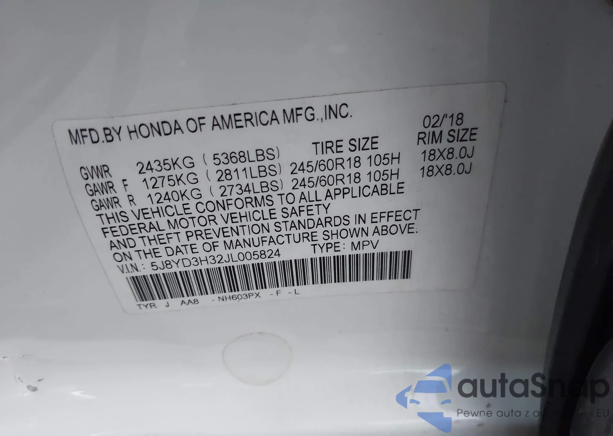 • VIN 5J8YD3H32JL005824