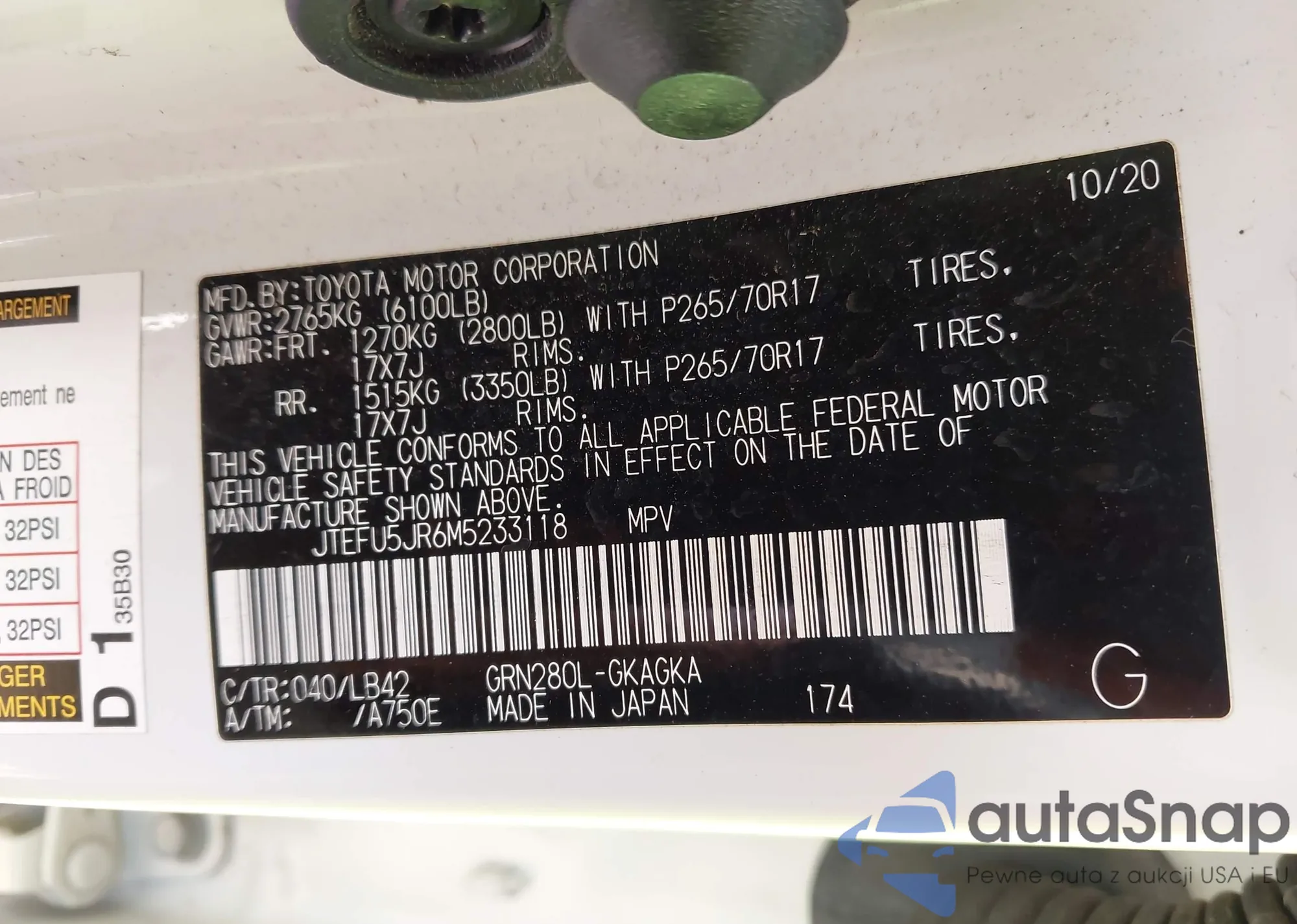 LOT: 43398226 VIN: JTEFU5JR6M5233118
