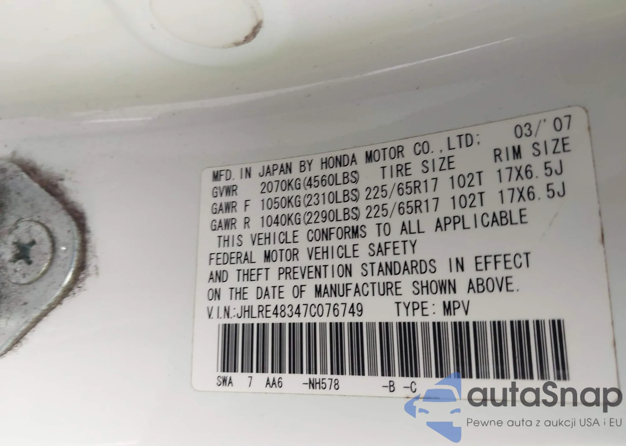 • VIN JHLRE48347C076749