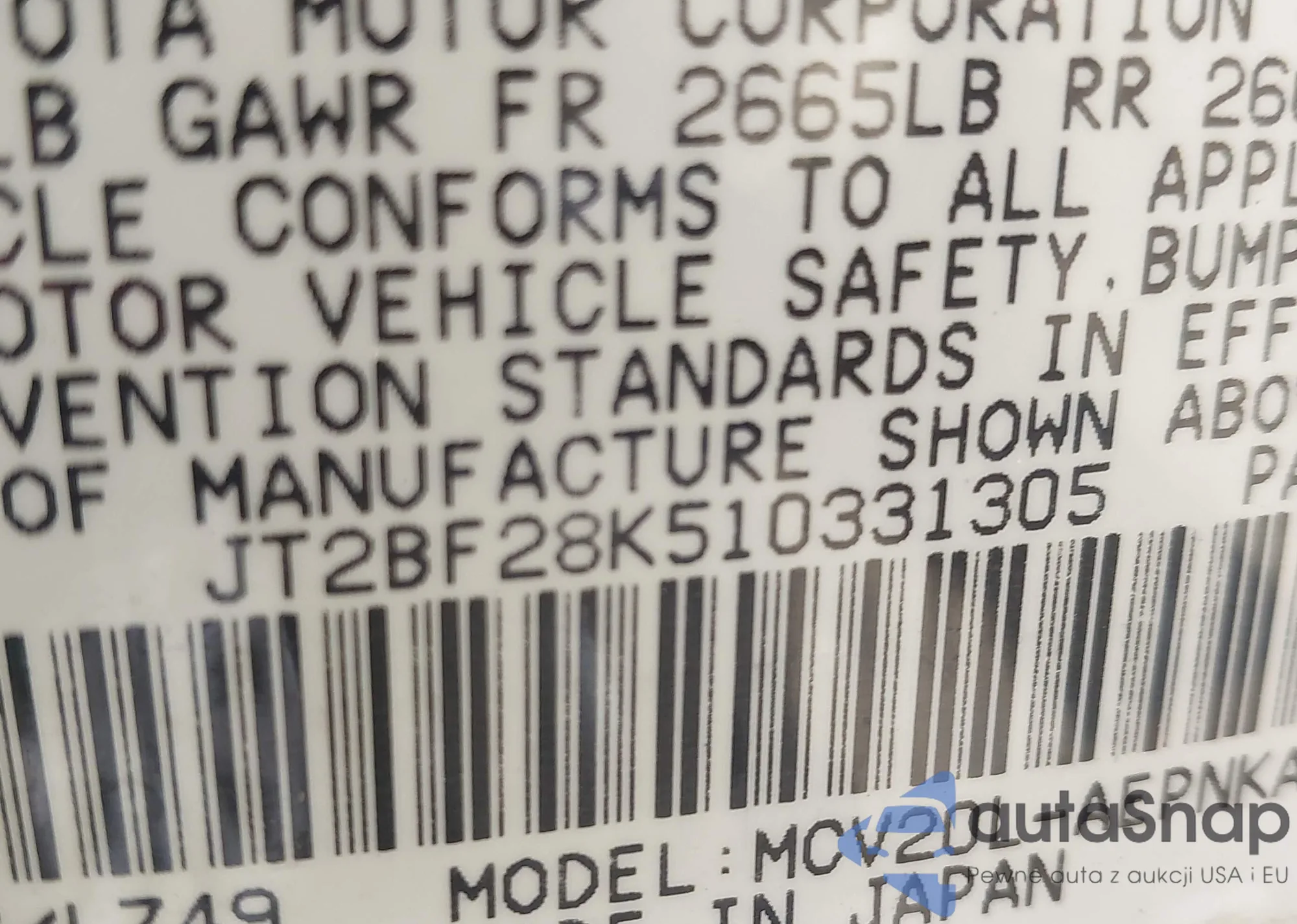 LOT: 43641906 VIN: JT2BF28K510331305