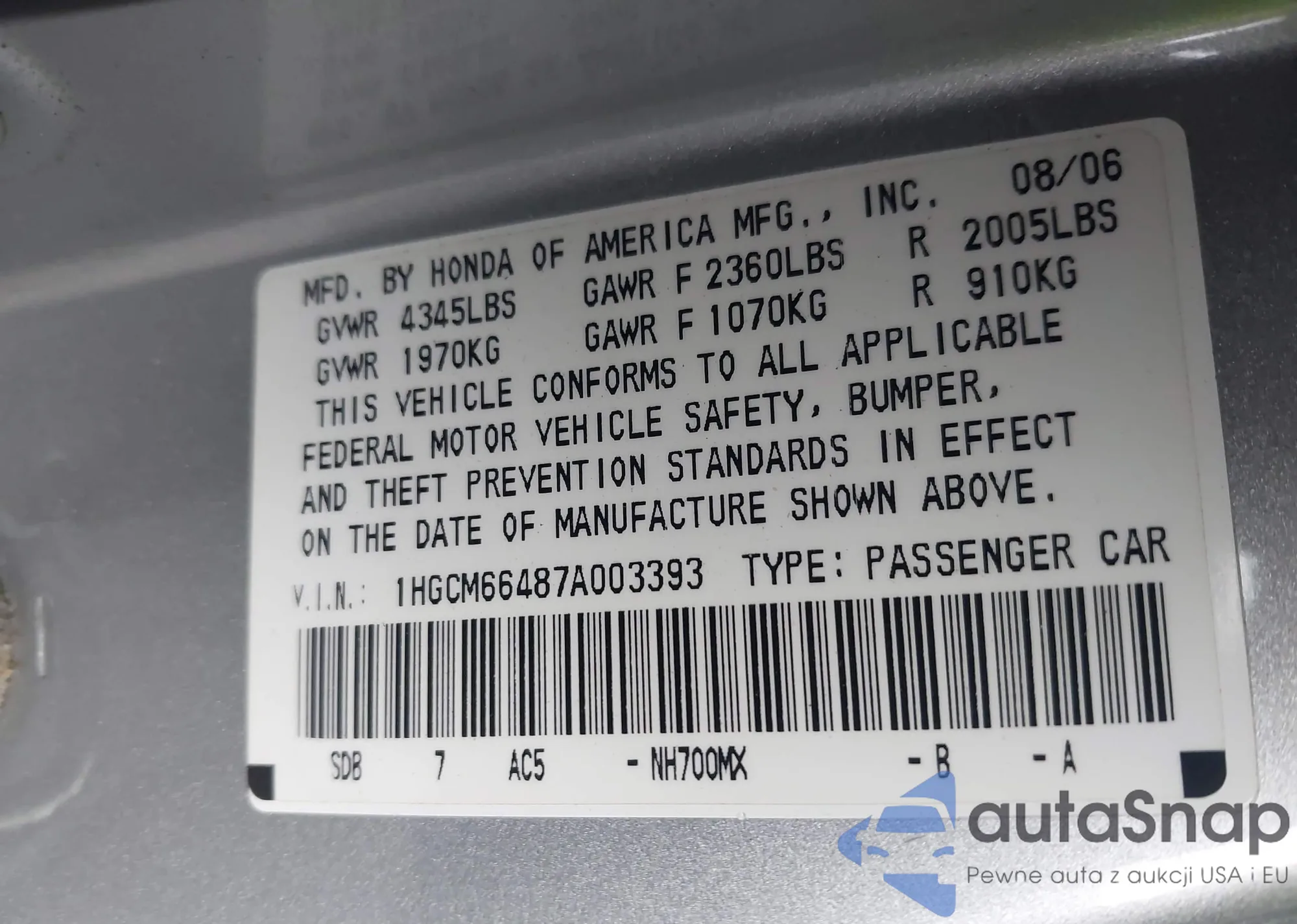 LOT: 43730979 VIN: 1HGCP25709A053736