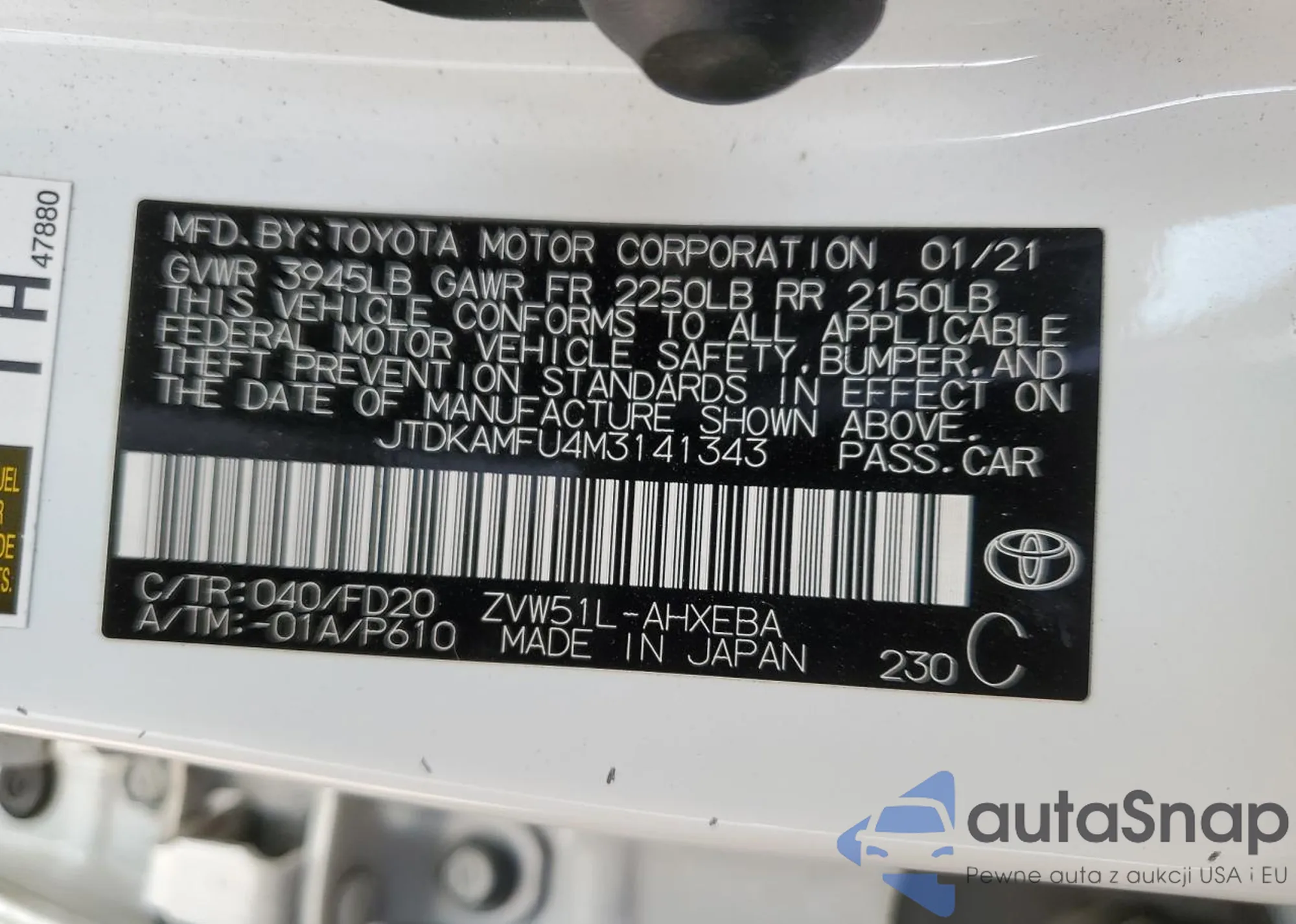 LOT: 91052265 VIN: JTDKAMFU4M3141343