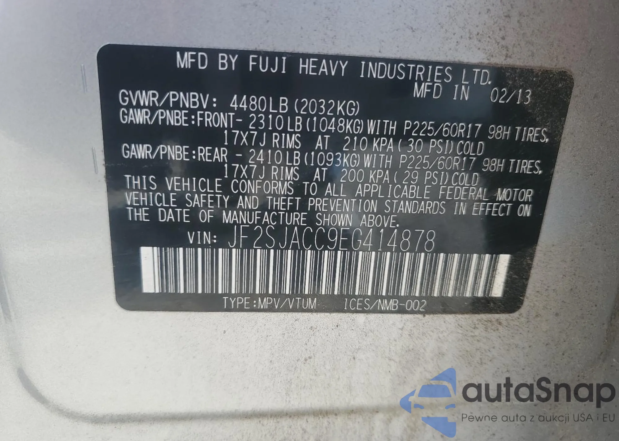 • VIN JF2SJACC9EG414878