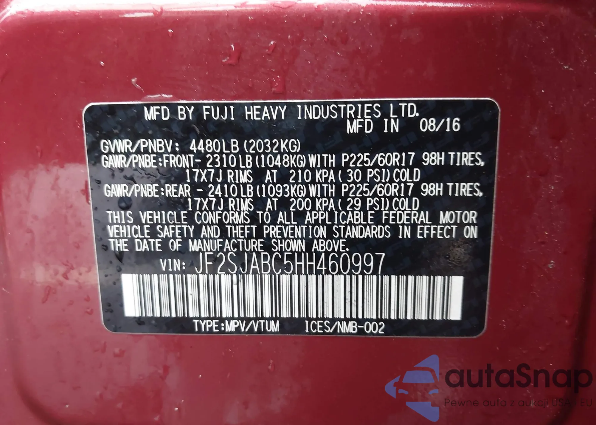 LOT: 43277002 VIN: JA4AP3AW6HZ047863