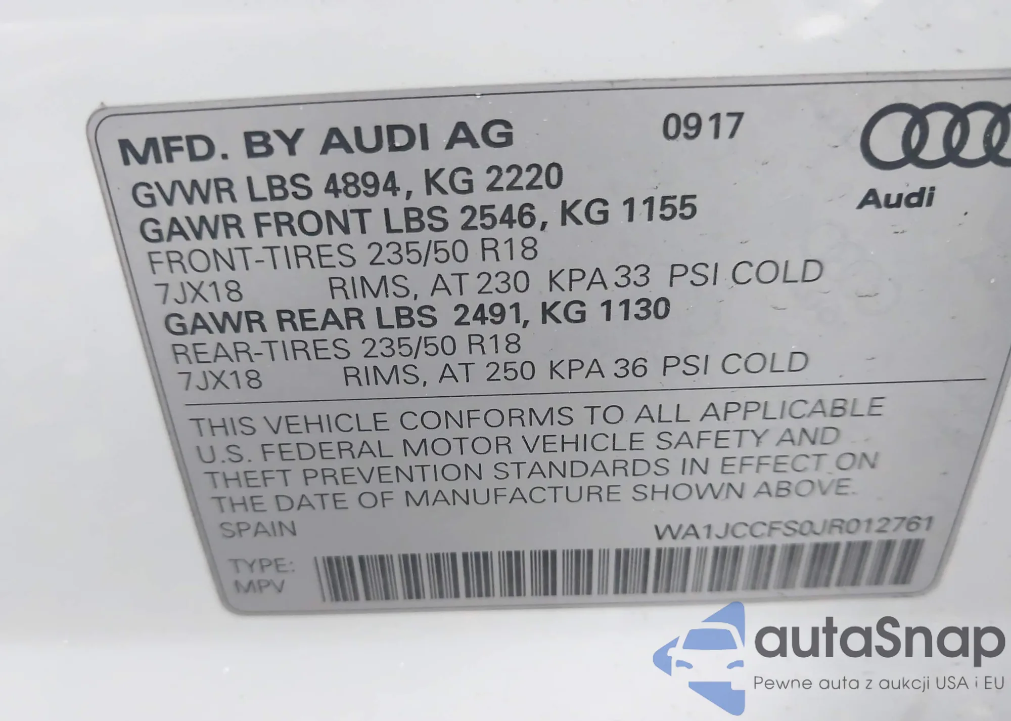 LOT: 43647780 VIN: WA1JCCFS0JR012761