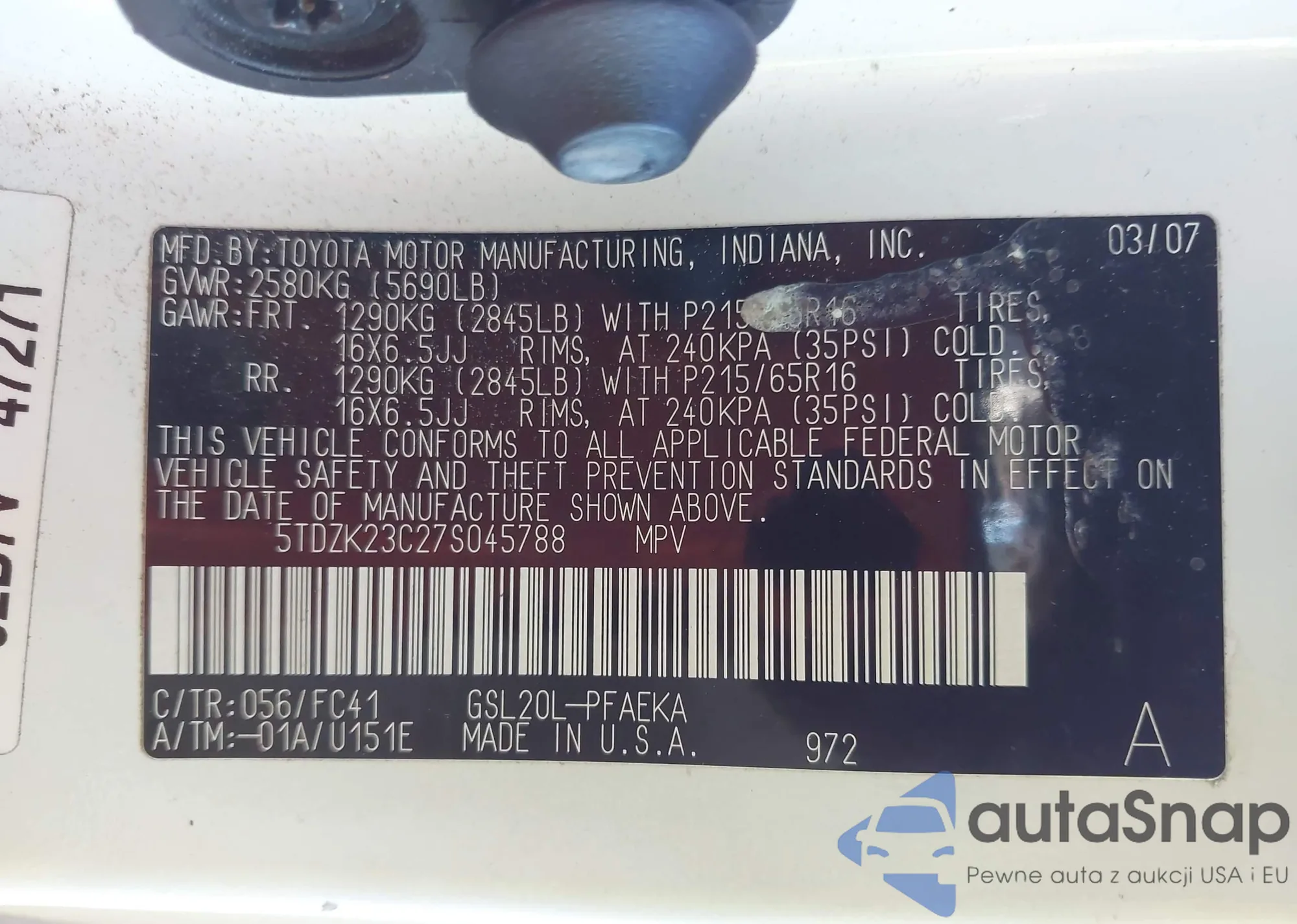 • VIN 4T1DAACK1SU601507