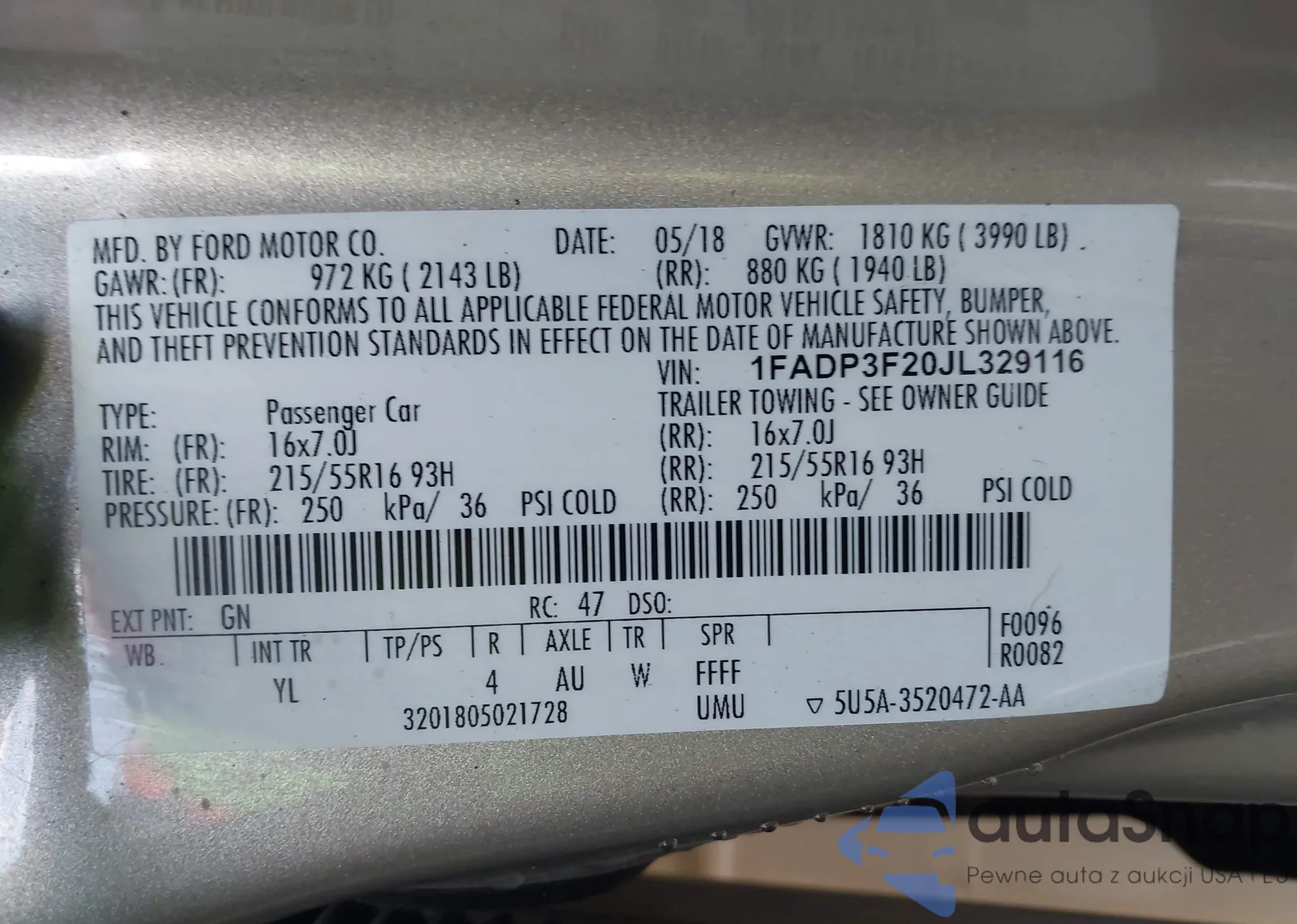 • VIN 1FADP3F20JL329116