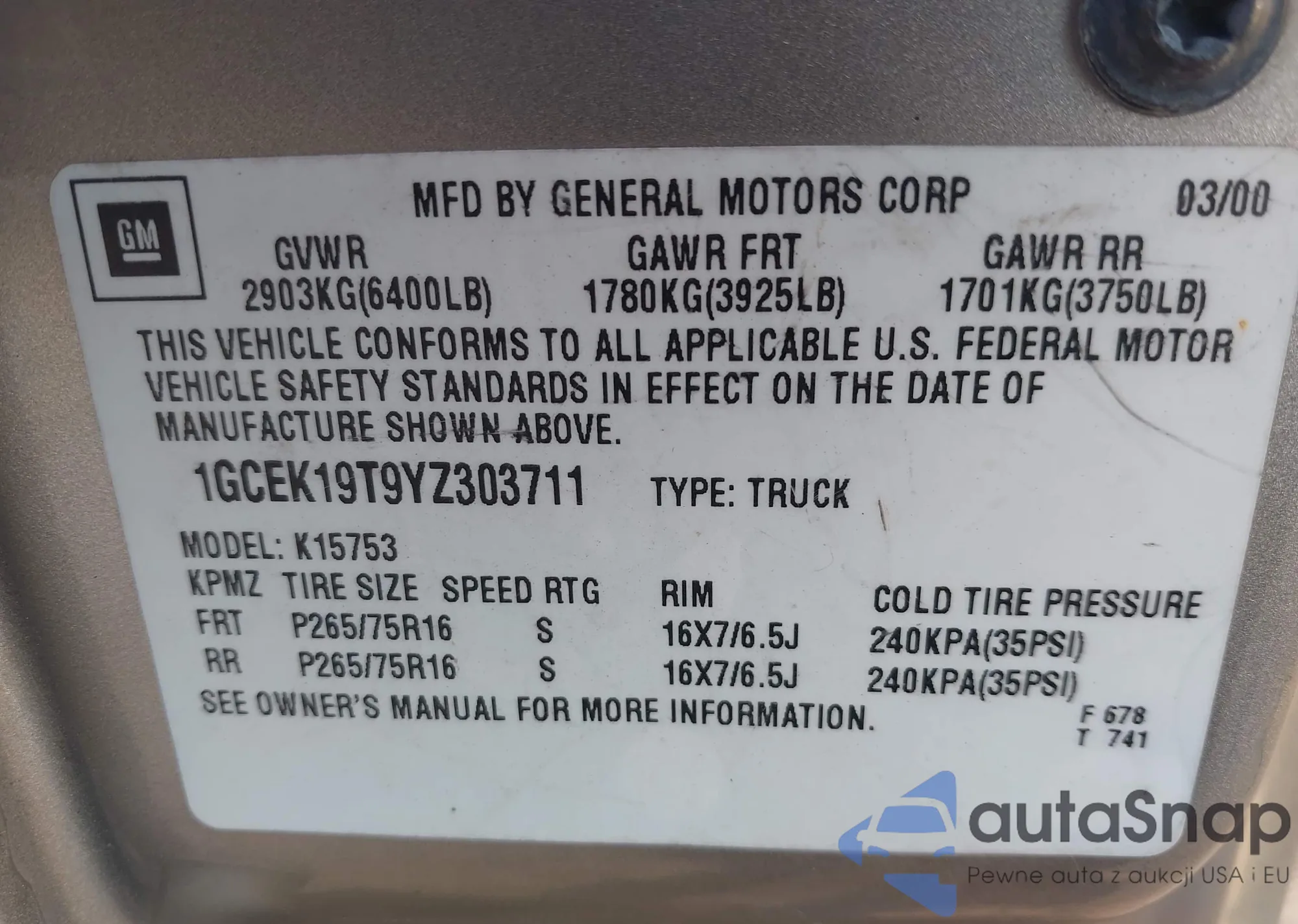 LOT: 43576854 VIN: 1GCDT196958180495