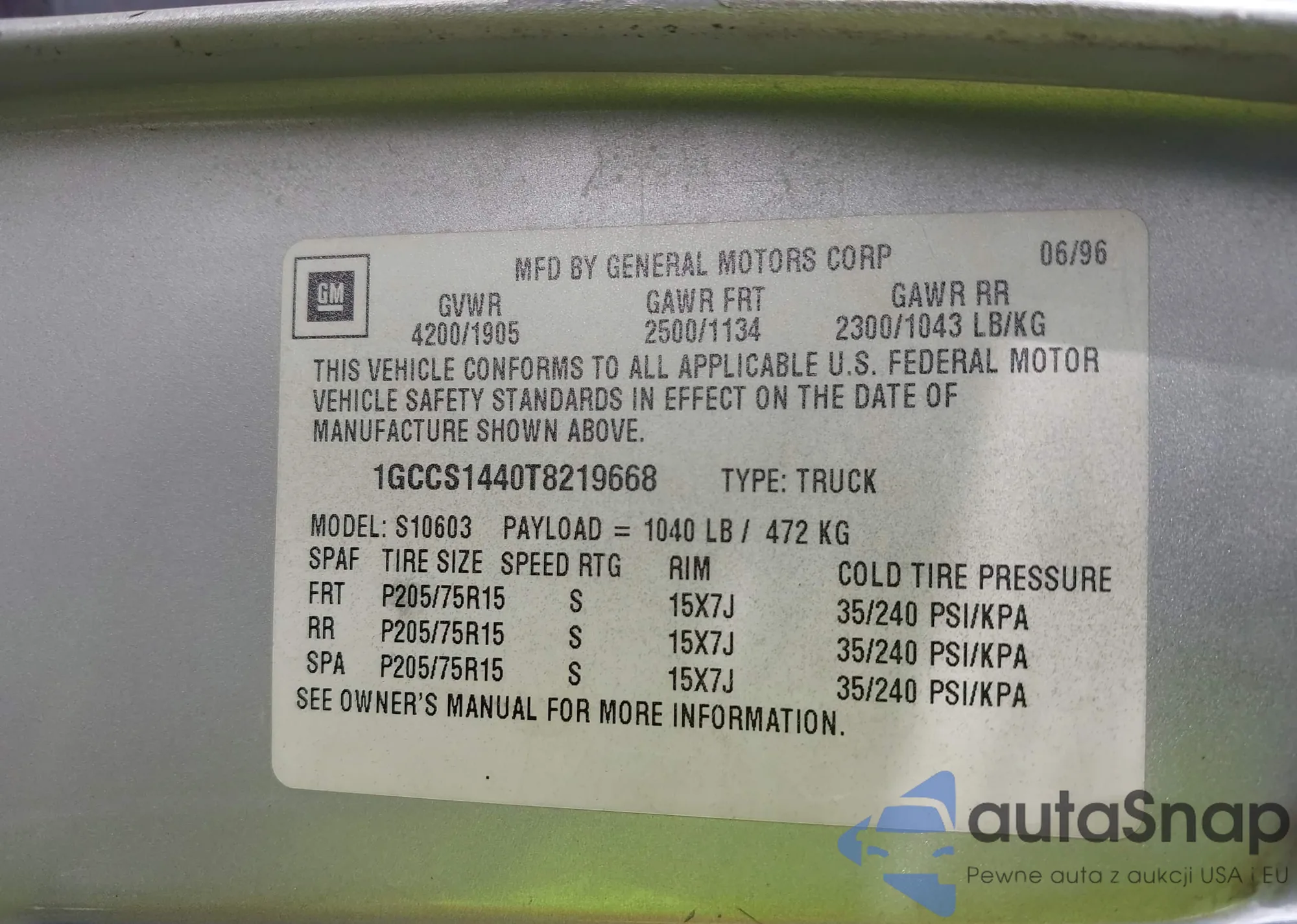 • VIN 1GCCS1440T8219668
