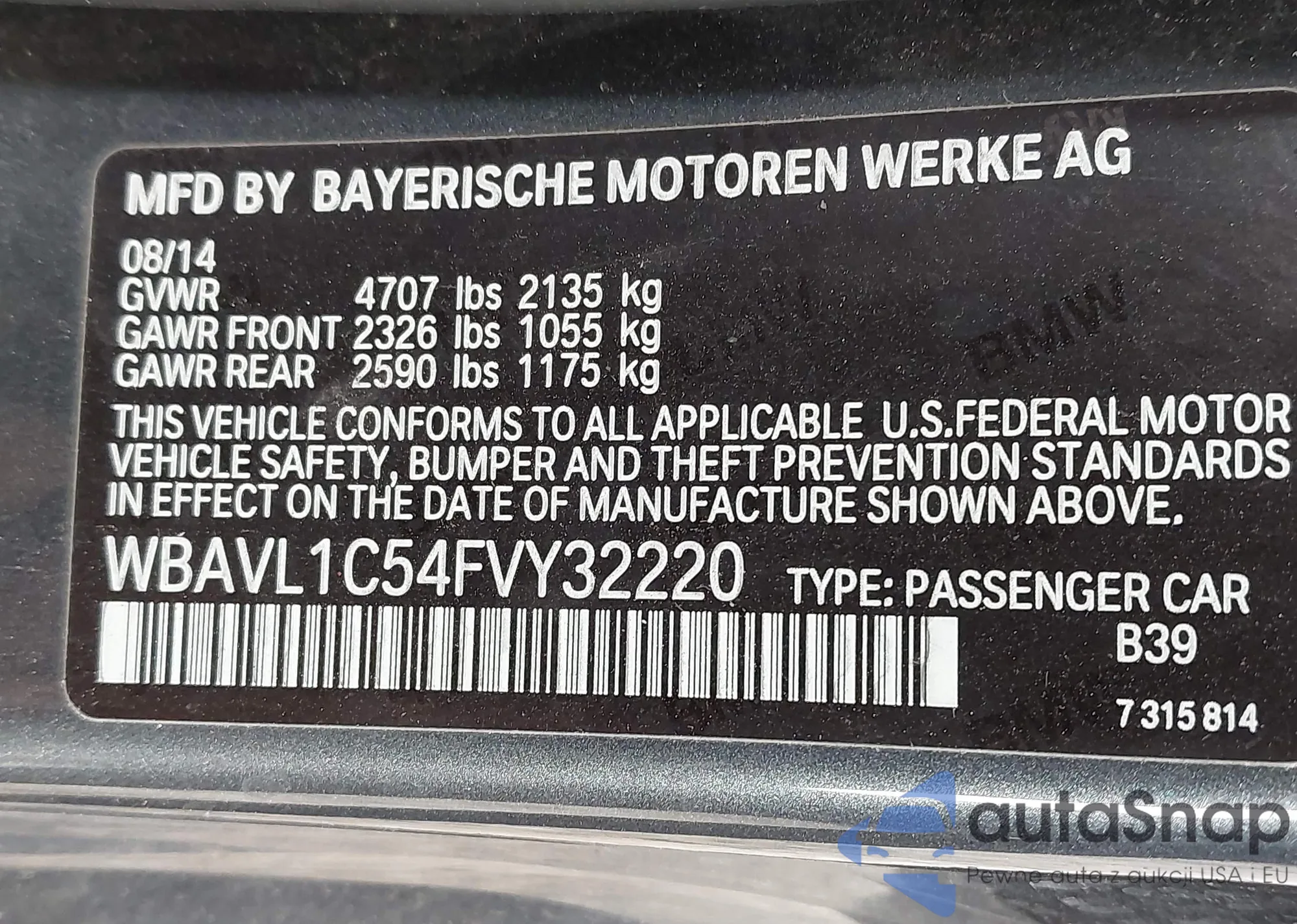 LOT: 43597221 VIN: WBAVL1C54FVY32220