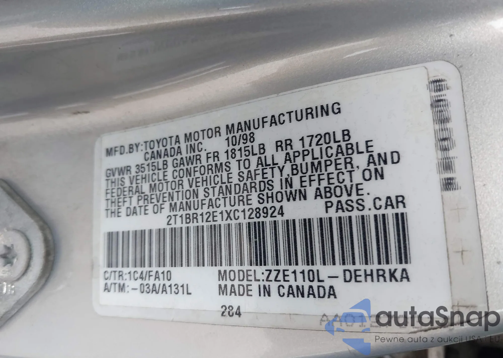 • VIN 2T1BR12E1XC128924