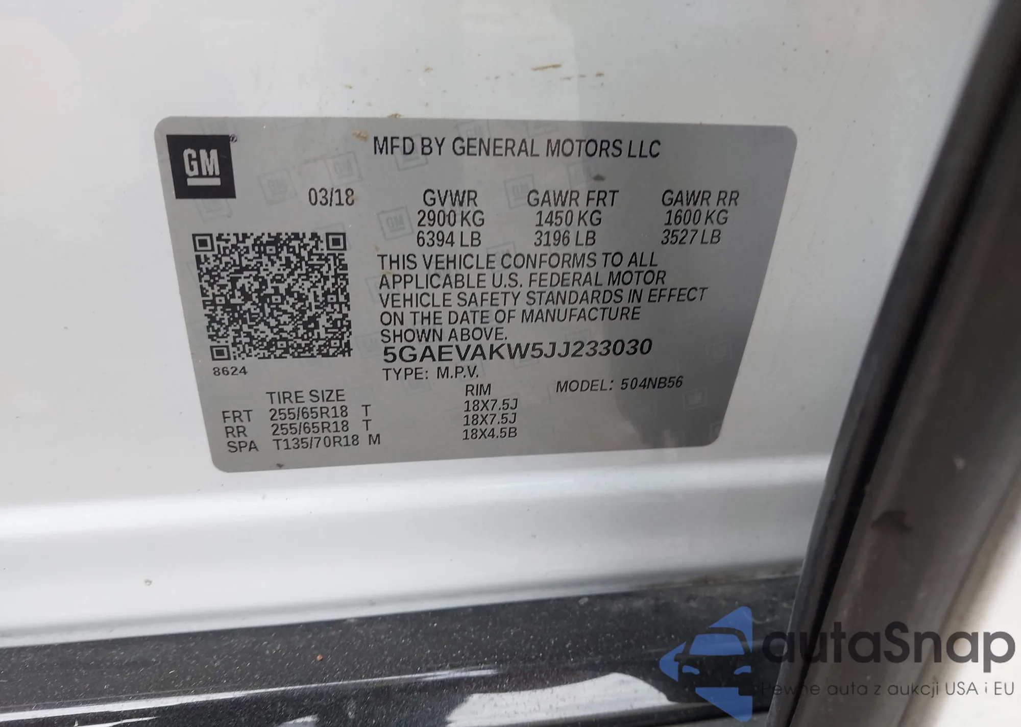 LOT: 43710210 VIN: 5GAEVAKW5JJ233030