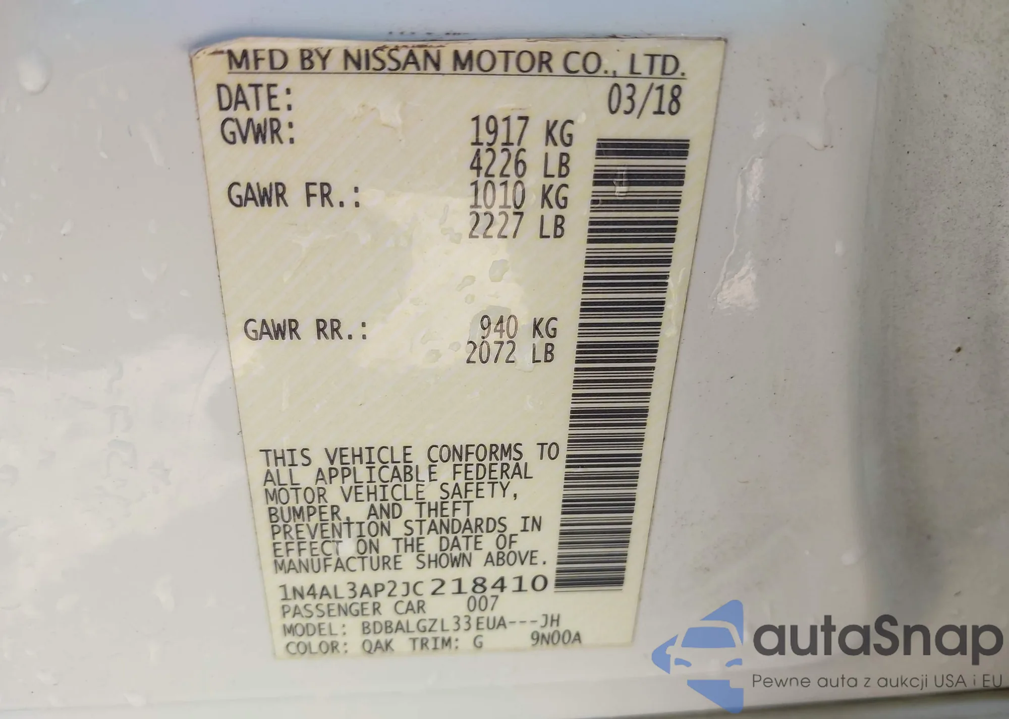 LOT: 43619366 VIN: 1N4AL3AP2JC218410
