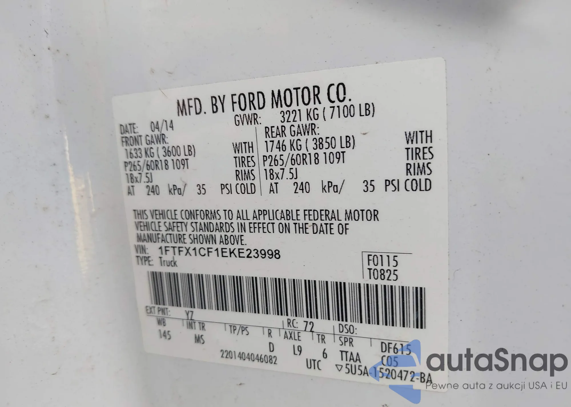 LOT: 43449945 VIN: 1FTFX1CF1EKE23998